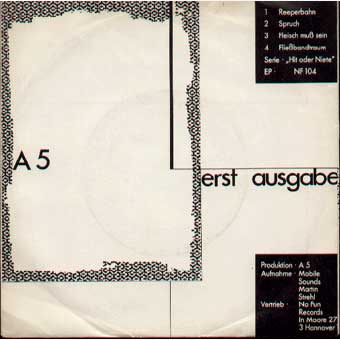 1980/No Fun 104 Reeperbahn/Spruch/Fleisch muß sein/Fließbandtraum ...kurz drauf kam die 2. Single "Kalte Erotik" raus, die aber weniger Punk ist "Fertig mit ihrer Single sind auch die Bremer A5, laut Info, Musiker, die die norddeutsche New Wave-Szene (iiihhh!) entscheidend mitgeprägt haben. Sie spielten vorher bei den Downers, 1980s, Blender und Krauts." (Alfred Hilsberg, Sounds Nr.10/80)