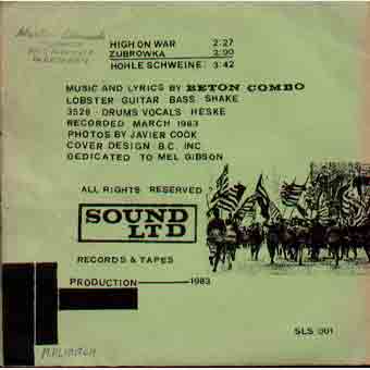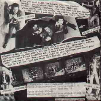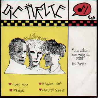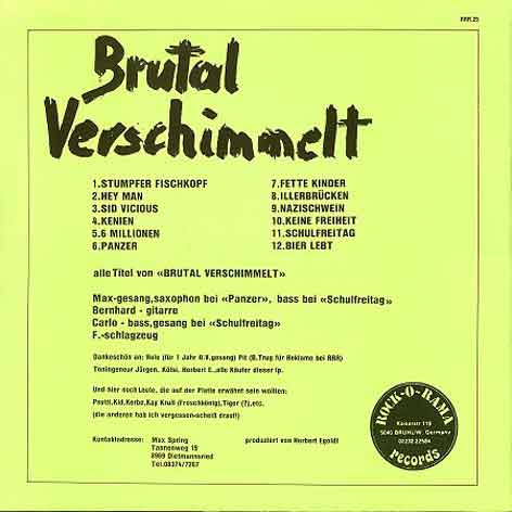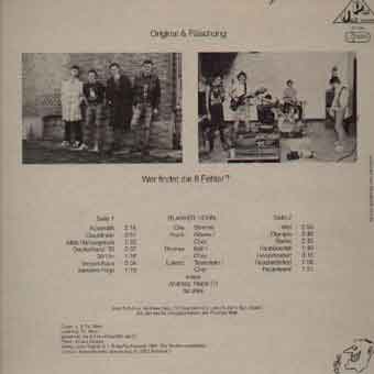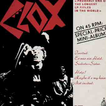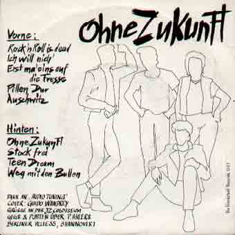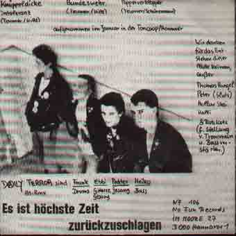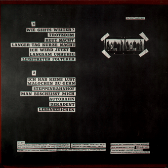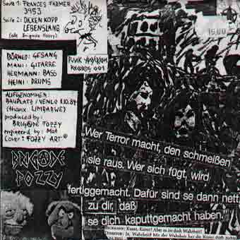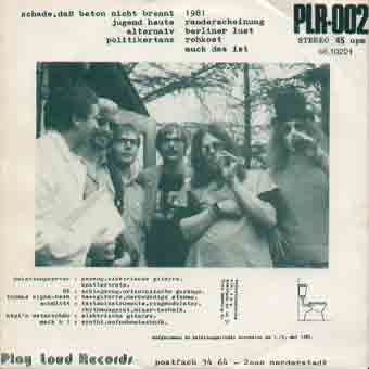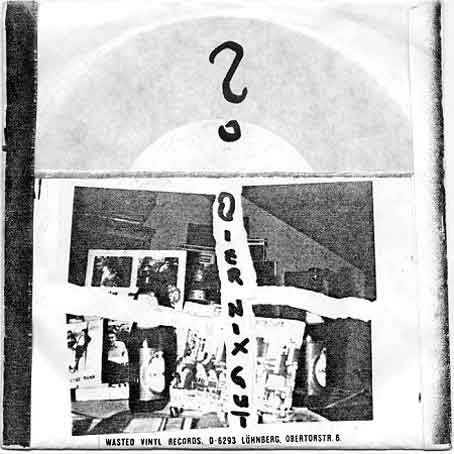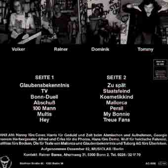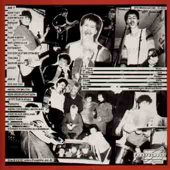 1981/Teldec Krank/Spiesser/Vögel/Plastik/Japanischer Freund/Schizophren/Cabriolet/Kontrolle/Sumatra/Dachau/Polaroid/Langeweile/Volkslied/Was wollt Ihr?/Konsummaschine/Freibier Gibt´s in 2 Auflagen, 1.Auflage kommt mit "Dachau" und Textheft. "Schon irgendwie wat von gehört oder gelesen? Nun ja, ist ja auch sehr unbekannt die Scheibe; es ist ja nicht meine Art, teure LP´s auf Verdacht hin zu kaufen, aber das Cover und der unbekannte Name der Gruppe hat mich dazu bewegt. Trotz alledem wurde ich angenehm überrascht, als mir angenehme Klänge und gute Texte um die Ohren schwirrten. Was man da zu hören bekam, waren keine ausgefeilten Avantgardeklänge oder schneller Hardcoresound, sondern mehr Songs, bei denen der text und die Stimme im Vordergrund stehen. Die 4 Jungs scheinen wohl sehr jung zu sein, wie aus den zahlreichen Fotocolloagen zu entnehmen ist (kaum älter als 16 oder 17 Jahre!). Das soll aber nicht heißen, daß die Jungs mit den TEENS zu vergleichen wären. Obwohl man beim Lauschen der LP manchmal wohlbekannten Sound à la HANS-A-PLAST, ABWÄRTS, DER MODERNE MAN raushört. Aber was solls? Zeig mir einer mal ne Gruppe, die so jung ist und so einen Sound entwickelt!" (C.Y., Lug & Trug Nr.2, 06.1981)