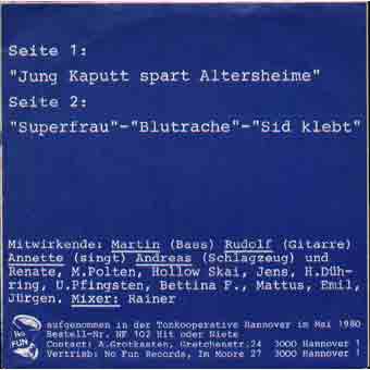 Jung kaputt spart Altersheime/Superfrau/Blutrache/Sid klebt "Auf der ersten 7inch bestand die 1979 gegründete Band aus Martin Fuchs (Bass, möglicherweise zuvor bei TBC), Rudolf Grimm (Gitarre), Annette Grotkasten (Gesang) und Andreas (Schlagzeug). Als weitere Mitwirkende werden aufgezählt Renate, M.Polten, hollow Skai, Jens, H.Dühring, U.Pfingsten, Bettina F., Mattus, Emil und Jürgen. Also Personen die man auch von anderen Bands wie Hans-A-Plast oder Der Moderne Man bzw. als Labelchef von NO FUN kennt." (Günter Sahler, Blecheimer und Luftpumpe #1) "Bärchen und die Milchbubis (No Fun). Das ist der Hannoveraner Pogo, eine (die?) Annette singt. Mein Rhythmus war der nie so (anderer Pogo schon). Ich fühl' da wahrscheinlich zu subversiv. Gerechterweise sollte vielleicht jemand anders diese EP besprechen, der sie mag. 'Das wird ein Hit', sagt mir jemand. Klar. 'Ich bin so einsam wie die Wölfe in der Nacht' ('Superfrau'). Und ich bin einfach zu neu - gierig für diese Musik, diese Texte. Das ist alles so starr, da bewegt sich doch seit zwei Jahren gar nichts." (Hans Keller, Sounds Nr.9/80) "Was soll das? Hannoversche Supersession? Hört sich allerdings eher an, als wenn HANS-A-PLAST, Sham 69 und BLITZKRIEG versuchen, zusammen ne Platte zu machen. Die A-Seite "Jung kaputt..." soll ja sowas wie ne neue Hymne sein. Armes Hannover." (Alles Tot Nr.8, 1980)