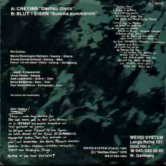 Dachau Disco "CRETINS mit "Dachau Disco", das ja auch schon vom NO FUN Sampler her bekannt ist, aber ein Klassiker der deutschen großen PunkRock-Zeit (79-81) ist, daher ist die Neuauflage gewiß OK. BLUT + EISEN sind auch recht gut, obwohl sie eigentlich nichts Neues ranschaffen." (A.D.S.W. Nr.9, 1985)