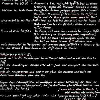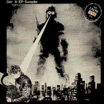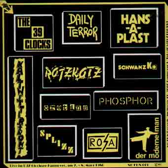 "Hannover No Fun" LP 1980/No Fun 001 Splizz: Tripping on Minster Beach/private keep out Cretins: Dachau Disco Der Moderne Mann: Das Disco-Lied The 39 Clocks: 39 Explosion heats Hans-A-Plast: Amerikaner Rosa: De Sade war hart Daily Terror: Andere Zeiten/Schmutzige Küsse Schwanzkann´s: Ich und mein Schwanz Kaltwetterfront: Disco-Boy Phosphor: Wald Rotzkotz: No name +Textheft [...] präsentiert der NO FUN SAMPLER, nur die sehr große Szene einer Stadt, Hannovers, und hierzu nun Alfred: Städte-Sampler haben ihre Nachteile; am Einerlei manches englischen Albums ist das nicht zu überhören. Last not least ist auch hier von den meisten Gruppen nur ein Stück zu hören die Schubladen und eine Sternchenverteilung gefährlich nah für vorschnelle Urteile. No Fun der Sound einer City? Schon eher, aber was ist Hannoversch dran? Die Splizz, eine aus Rotzkotz hervorgegangene und schon wieder aufgelöste Gruppe, wärmt einen zum Anfang richtig auf. Auch wenns am Schluß ins Traditionelle abrutscht, die Gruppe hatte überdurchschnittliche musikalische Qualitäten. Und Phil ist ein starker Sänger. Folgen die Cretins mit einem makabren Song, der Dachau Disco. Überraschend gut für eine Kid-Band. Deutsche Texte, wie auch beim Modernen Man, die für mich auf der Studio-EP etwas konzentrierter-überzeugender wirkten. Von 39 Clocks dürfte noch mehr zu erwarten sein. Ohne Schlagzeug, dafür mit Rhythmus-Maschine, haben sie - mangels Live-Aufnahme ein im Studio produziertes Stück beigesteuert. Schade, daß sie englisch singen. Hans-A-Plast am Schluß der ersten Seite mit Amerikaner so gut wie eh und je. Schade, daß kein neues Stück von ihm aufgenommen wurde. Ganz abwechslungsreich, die gesamte A-Seite. Zum Verwechslen ähnlich dagegen einige Aufnahmen der B-Seite. Peinlich fast das Stück von Rosa (De Sade war hart). Ihrem Pogo-Revival entsprechend annähernd auch Schwanz kanns (Ich und mein Schwanz) und Phosphor (Wald). Und selbst noch bei Kaltwetterfront (Disco Boy) könnte man meinen, alle diese halb-harten-halb-schnellen Bands hätten den gleichen Sänger. Daily Terror aus Braunschweig zählen zu den Höhepunkten der Platte. Zwei gegensätzliche Stücke. Andere Zeiten mit Anleihen beim Reggae, Schmutzige Küsse, ein reichlich pogoiger Song mit Gitarrensolo. Rotzkotz (No Name) merkt man die langjährige Erfahrung an; ihre Professionalität kommt auf dieser einen Aufnahme genausowenig zur Geltung wie die Qualitäten anderer Gruppen. No Fun ein Muß? Zumindest eine erste Information für allen Auswärtigen. Die Pogo-Fans werden die Platte mögen, und die anderen werden sich ihre Rosinen herauspicken. Fazit: Etwas weniger Bands und etwas mehr Aufnahmen von jeder Gruppe hätten dem Hannover-Sampler gut getan. Und warum immer noch englisch gesungen wird, ist mir ein Rätsel. (Diedrich Diederichsen und Alfred Hilsberg, Sounds, Nr.5/80) "Dieser Sampler ist echt ein Unikum unter der traurigen Serie der bisher erschienen New Wave Samplern in der BRD: Erstaunlich gute Aufnahmequalität, sehr gut abgemischt und optimale Songauswahl. War es zB bei den Hamburger Samplern so, daß durch die Veröffentlichungen auf diesen Platten, den vertretenen Gruppen oft mehr geschadet als genutzt wurde, werden auf dieser Scheibe im Gegenteil oft die sehr bescheidenen Musikkünste mancher Gruppen durch die Technik in ein besseres Licht gerückt. Nehmen wir als Beispiel mal SCHWANZ KANNS - auf der Bühne die totale Nervtruppe, geht ihr Stück ziemlich gut los, teilweise wohl auch nur, weil der Hall oft ziemlich verstärkt ist. Oder ROSA - ihre monotone Provokation, die beim Gig über ne halbe Stunde recht nervend war, ist hier auf ein paar Minuten komprimiert und dadurch wirkt das Stück (?) schon fast genial, es macht wirklich Spaß sich LSD auf Platte anzuhören. Daneben sind die beste Band wohl DAILY TERROR, von denen mit recht gleich zwei tolle Titel drauf sind: Einmal ne irre Ska-Nummer und als zweites ein altes BOMBED BODIE Stück als Total-Pogo. Daneben wären vielleicht noch der MODERNE MAN erwähnenswert. Ziggy´s total aggressive Stimme vermittelt einen ganz guten Eindruck, wie es beim MODERNE MAN Gig zugegangen ist, die Musik allemal besser, vor allem dichterer Klang als auf der Single. Schade finde ich, daß von SPLIZZ keine dieser tollen Skaversionen von 60iger Hits ist, sondern das für mich lahmste stück des des Sets auf dem Sampler vertreten ist. Die widerlichste Gruppe auf diesem Sampler ist für mich allerding CRETINS - die mögen ja tolle Pogomucke machen, aber durch diese Scheiß-Texte werden sie für mich zu einer der abstoßendsten Gruppen, die ich kenne. HANS-A-PLAST "Amerikaner" ist zwar ganz gut und schnell gespielt, aber mittlerweile kommt wohl jedem die LP langsam aus der Nase raus, so daß das eigentlich ein bißchen überflüssig ist. Doch insgesamt ist die LP ganz gut und vermittelt wirklich mal einen guten Eindruck vom Geschehen." (Bobby Blitzkrieg, Alles Tot Nr.6, 1980) "Auffallend an diesem Sampler ist, daß wir nur die kommerziellen, geglätteten Mainstream-Punk-Bandsaud Hannover darauf versammelt haben. zB SPLIZZ, wobei uns immer noch nicht klar ist, was die SOUNDS an der "exaltiert-tuntigen" Stimme von Phil Luland gefressen hat. Und überhaupt: das Saxophon ist vielzu perfekt, die Gitarre sogar gestimmt, der Bassist ein Modepunk, am Schlagzeug ein Kind mit exaktem Timing - bereits total versaut. Anschließend die CRETINS - reine "Modepunkfürze", die es auch noch schaffen, einen auf Punk zu machen - direkt gemein sowa. (Wir hören sie uns heimlich an). Und der MODERNE MAN ist mit seinem "Disco-Lied" über die Untersecunda nicht hinausgekommen. Avantgardistische Kunstkacke? PHOSPHOR - dumm wie ne Stulle, aber Rockmusiker müssen ja strohdoof sein, damit die Post abgeht. Bei HANS-A-PLAST erübrigt sich von vornherein jeglicher Kommentar - 15.000 verkauft LP´s und demnächst ein Auftritt im Rockpalast sprechen für sich. Und der Polit-Müsli-Verschnitt von KALTWETTERFRONT haut noch nicht mal 