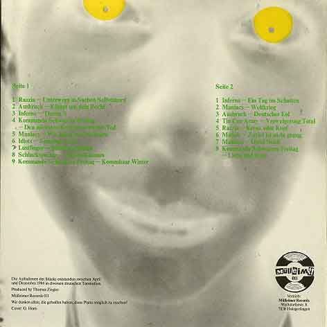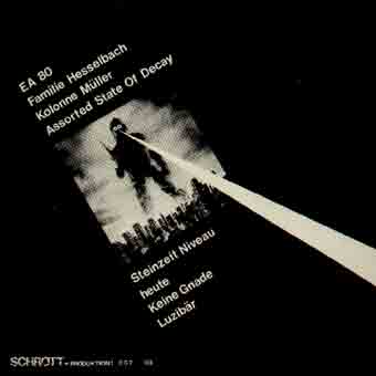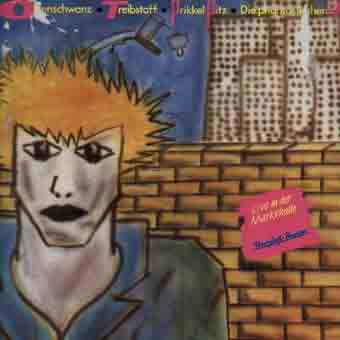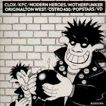 "Schallmauer" LP 1980/Schallmauer 001 Östro 430: Sexueller Notsand/Triebtäter/Too cool Motherfunker: ?/? Modern Heroes: Angst/Alles in Ordnung Originalton West: 01168 Clox: No attitudes Popstars: No.10 VD: Akne KFC: Du klaust überall/Ich häng mich auf/Gefangen in der BRD/Stumpf ist Trumpf +Infobeilage Die meisten Sampler, englische wie deutsche, amerikansche, wie finnische, haben ihre Tücken. Einige sind einfach schlecht produziert, andere bieten bekanntes Material diverser Longplayer, wieder andere strotzen vor Langeweile, weil die Bands sich wie ein Ei dem anderen gleichen. Die meisten sind einfach überflüssig. SCHALLMAUER gehört zu keiner dieser negativen Kategorien. Der Lothar vom Neußer Schallmauer-Plattenlädchen hat acht Gruppen aus dem Ruhrgebiet zu dem bislang besten deutschen Sampler vereint. Kaum anzunehmen, daß ein Konzept hinter dieser Sammlung steckt. Da hat wohl eher der Zufall einige interessante Geräusche zustandegebracht. Die überwiegend instrumentalen Funkboten (Motherfunker) aus Düsseldorf, die um Auflockerung des Punk bemühten Modern Heroes (aus Dortmund), die leider nur mit einem Titel vertreten und thematisch an Male erinnernden Originalton west aus Neuß, die am ehesten dem Punk-Klischee entsprechenden Clox aus Dortmund und die dem Beat-Sound verhafteten Neußer Pop Stars sind alle hörenswert, aber ihre reichlich traditionell geprägten Darbietungen durchbrechen die Schallmauer nicht. Drei Gruppen allerdings verursachen Ohrensausen, machen Lust auf mehr und SCHALLMAUER unentbehrlich: Östro 430, die Girl-Band aus Düsseldorf mit ihrem eigentümlichen, von Keyboards geprägten Minimalsound; dann VD, ebenfalls aus Düsseldorf, mit ihrem Akne-Song, den Bravo getrost ihren weiblichen Lesern anstelle ihrer Hautcreme-Anzeigen empfehlen sollte. Und endlich, endlich ist er da: Der KFC! Angekündigt von Jerry Cotton, präsentiert der Katholische Fanfaren Chor einen Einblick in deine und meine und in die KFC-spezifischen Niederungen unerfüllten Lebens. Nur das Gefangen in der BRD, ein Song aus früheren Trimpop-Zeiten, kommt zu bierernst rüber. Dafür hat sich der Tommi mit Stumpf ist Trumpf ein Denkmal für durchblick gesetzt. Aber mich mit Helmut Schmidt in einem Atemzug zu nennen mein Stumpfsinn ist doch etwas stumpfer, lieber Tommi. (Alfred Hilsberg, Sounds Nr.9/80) "Meine Damen und Herren, wir übertragen Live von der SCHALLMAUER-Olympiade, sie kommen gerade richtig, wir haben soeben den 4x100 Meter Lauf erlebt, den die Manschaft der Kleinen Frechen Chaoten klar gewann! War der erste Läufer der Staffel "Du klaust überall" noch sehr schwach, so rissen "Ich häng mich auf" und "Gefangen in der BRD" den Lauf noch aus dem Feuer, so daß Schlußläufer "Stumpf ist Trumph" einen ungefährdeten Triumph ins Ziel laufen konnte. Die von Hollow Skai verteilten Medaillen trieben den 4 das Wasser in die Augen. Rührend. Aber weiter zum Dreisprung, wo einmal mehr ÖSTRO 430 ihre Überlegenheit unter Beweis stellen. Mit 2 tollen Sprüngen, "Sexueller Notstand" und "Triebtäter" ließen die Konkurenz weit hinter sich, wobei allerdings gesagt werden muß, daß sie sich mit einem Saxophon abstützten. Zum Eklat kam es als Linienrichter Alfred E. Hilsberg den 3.Sprung aufgrund ausländischer Einflüsse für ungültig erklärte. Beim Weitspringen in den Eiter war VD, genannt "Akne", nicht zu besiegen. schneller, höher, weiter, auch hier das Motto. Die erste Sensation gabe es, als die hocheingeschätzen MOTHERFUCKERS beim Fußball von den MODERN HEROES mit 2:0 besiegt wurden, aber das ist ja das Gute im Sport, hier kann jeder jeden schlagen. Die Manschaften von ORIGINALTON WEST und POSTARS schieden schon im Vorlauf aus. Schade, Jungs, aber es wird schon werden. Gerade jetzt wird die Olympiade von Olympiasprecher CLOX beendet. Eine schöne Sprache und eine nette Rede. Dieser Wettkampf ist erwähnenswert, weil die hier angetretenen Manschaften alle sehr gut trainiert waren und sich meistens in bester Verfassung vorstellten. Nur schade, daß Willi Wucher mit seinen WILDEn SÄUEn wegen Dopings nicht zugelaßen wurden." (Frank westermann, Alles Tot Nr.8, 1981)