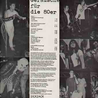 "Geräusche für die 80er" LP 1980/ Zick Zack ZZ3 Abwärts: Punkte/Caprifischer Salinos: Meine Freundin/Juso-Rock Razors: We love you/City Boy/Subway Liebesgier: Du bist alles/Ich spür eine Gier/Geschwindigkeit/U-Bahn Coroners: Berlin/I don´t know/Ihr Kinderlein kommet Die 1.Auflage (3.000 Stk) kam mit einer Bonus Flexi von MINUS DELTA T. Zum dritten und bislang größten Festival neuer Musik in Deutschland hatten sich Musiker und Publikum aus allen Teilen der BRD sowie aus England, der Schweiz und Österreich eingefunden die Markthalle war eine Stunde nach Eröffnung ausverkauft, Hunderte warteten im Vorraum, andere fälschten Stempel oder schlichen durch Seiteneingaänge der Erfindungskraft waren keine Grenzen gesetzt. Das Interesse des Publikums war eben so vital, wie bei keinem der ihremSet aufführenden Gruppen, die sonst in der Markthalle spielen. Vom äußeren Erscheinungsbild her teilte sich das Publikum in drei Gruppen: Hardcore-Punks mit Pistols- und Clash-Badges, London 77; Avantgardisten in Fantasie oder Roboterkleidung, grell oder dezent, Tabea Blumenschein, Kraftwerk oder Bowie; schließlich alle möglichen, die einfach interessiert waren, die wissen wollten, was passiert. Von dieser Gruppe hatte es in den beiden vorhergegangenen Punk-Nächten wesentlich weniger gegeben. Bei der auswahl der Bands war auf zweierlei geachtet worden erstens, daß die Bands möglichst wenig öffentlich gespeilt haben und vor allem noch an keiner anderen Punk-Nacht teilgenommen haben und zweitens, daß eine gewissen Ausgewogenheit zwischen Pogo-Punks und Avantgardisten besteht, denn schließlich war es ein Benefiz-Konzert für einen neuen Club in Hamburg in dem die beiden Sektionen der neuen Welle ihren Platz finden sollten. Eigentlich waren sich nur bei Rotzkotz, die als letzte nach Mitternacht, RocknRoll (back to the roots) spielten, alle einig, alles was davor geschah, ließe sich, wollte man es sich einfach machen, auf den Satz reduzieren, den einige (waren es Punks?), während des Auftritts von Liebesgier skandierten: Wir sind intolerant!. Fraktionskämpfe und schlachten bestimmten den Abend. Die Punks, in der Überzahl und selbstbewußter, hatten relativ ungestört ihren Spaß bei den Hamburger Bands Abwärts, Razors und Coroners. Mir haben davon Abwärts am besten gefallen, Alfred die Razors, meinem Nachbarn die Coroners, aufgeregt haben sie niemanden. Tempo mit ihrer Beat-Musik, manchen etwas suspekt, wurden von, angeblich extra zu diesem Zweck angereisten Berlinern von der Bühne gepfiffen. Bei Liebesgier, einer vier Frauen/ein Mann-Band aus Berlin, die mit von New York beeinflußter, aber sehr eigenständiger Minimal-Radikal-Musik (deutsche Texte), nicht nur mich zu begeistern wußten, standen sich die Aufhören!-Rufer und die Zugabe-Rufer, ungefähr gleichstark gegenüber. Minus Delta T, die beste Band des Abends und für mich der beste Live-Auftritt seit Monaten wurden schließlich gewaltätig von der Bühne geholt. Ihre Musik voller kleiner, hektischer Bewegungen, mit Cello, Synthi, Bohrmaschine, Staubsaugerschlauch etc. hatte dabei sogar im nicht-Avantgarde-Lager Freunde gefunden, es fanden sich Leute, die dazu Pogo tanzen konnten. Außerdem hatten sie das nötige Selbstbewußtsein, das Liebesgier fehlte, sich den Attacken des Publikums zu widersetzen. Schließlich kam es zu einer kurzen Schlägerei auf der Bühne, zu Aggressionen im Publikum, die erst Rotzkotz wieder entspannen konnten. Man macht es sich zu einfach, wenn man hier Punks und Avantgardisten, kunstschule und Straße, toleranz und Intoleranz, gegenüberstellt. Die Liebesgier-Musikerin, die nach ihrem Auftritt auf üble weise von Berliner-Punk-Frauen verprügelt wurde, die Langhaarigen, die immer, wenn sie die Gelegenheit fanden, die gerade spielende Band von der Bühne zu schreien versuchten das alles weist auf komplizierte Fraktionsbildungen hin. Lokale Auseinandersetzungen, Kollegenneid, was auch immer die Atmosphäre war giftig, das Festival nur unter dem Aspekt zu ertragen, daß es eben zur Zeit keine andere Möglichkeit gint, neue Musik an die Öffentlichkeit zu bringen und, daß der Zweck des Festivals war, sich selbst überflüssig zu machen. Ob allerdings die kontinuierliche Arbeit eines clubs, die rivalitäten zu entspannen hilft, bleibt die Frage. Wir werden uns damit in der nächsten Ausgabe auseinandersetzen. Geräusche für die 80er war trotzdem das beste Festival, das wir uns zur Zeit wünschen können, weil Widersprüche manifest und z.T. ausgetragen wurden, weil es gute neue Musik live zu hören gab, allein eine halbe Stunde Minus Delta T wären das Eintrittsgeld wert gewesen. P.S.: Versäumt have ich die Salinos. Augenzeugen differenzieren zwischen Offenbarungseid und Katastrophe. (Diedrich Diederichsen, Sounds Nr.2/80)