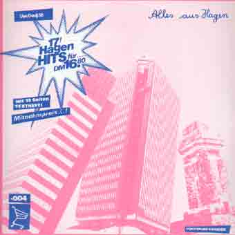"Alles aus Hagen" LP 1982/Tonträger 58 Himmelswillen: Zugverkehr Kein Mensch!: Donald und die Bullenschweine Kleinkrieg: Volmestrand Michael Wunder (Duo Stravagante): Bänke für den Park Horst Werner Wiegand & Kanthaken Quellfrisch: Alleestraße Radiopassiv: Grün und grau No Names: Einkaufsvision Wolfgang Luthe & The Wirtschaftswunder: Ich steh auf Hagen Vrontal: Keine Eile EROC: Hagener Wellenreiter Marianne Rosenbär & Extrabreit: Komm nach Hagen DIN A4 (Just For Fun): Hagen und überhaupt Betamax: B54 X-Quadrat: Hagen Information Jägerschnitzel: 22 Frohnatur: Hagen ist tot Sperrmüll: Für Rudi Kommt mit fetten Beiheft (32 Seiten). Genialer Städtesampler, der einen Querschnitt, der damals sehr aktiven Hagener Szene bietet (aber wo ist eigentlich Nena? Oder hatte damals schon jemand geahnt, daß sie heute zusammen mit Pur auftritt...).