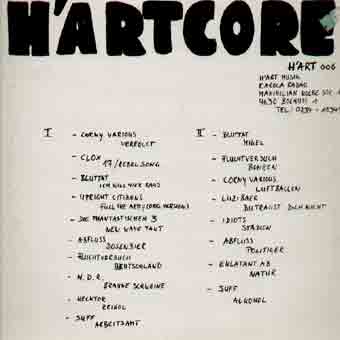 "H´artcore" LP 1981/H´art 006 Corny Various: Verfolgt Clox: 17/Rebel Song Bluttat: ich will hier raus Upright Citizens: Fuck the army (Orig.Version) Die Phantastischen 3: New Wave Takt Abfluss: Dosenbier Fluchtversuch: Deutschland N.D.R.: Braune Schweine Hecktor: Reinol Suff: Arbeitsamt Bluttat: Mikel Fluchtversuch: Bonzen Corny Various: Luftballon Luzibaer: Du traust dich nicht Idiots: Stadion Abfluss: Politiker Eklatant AB: Natur Suff: Alkohol "Der auf dem Bochumer H´ART Label erschienen Sampler stellt jede Menge Bands aus dem Ruhrpott vor, wobei jedoch meistens Masse statt Klasse regiert. Zwar ist der Sampler schon etwas älter, doch die meisten Gruppen dürften noch existieren. Am besten fand ich noch EKLATANT AB, gefolgt von BLUTTAT und CORNY VARIOUS, die allerdings ziemlich dumme Texte hatten. EKLATANT AB hatten das längste Stück der LP, ich nehme an, so 5 Minuten, wenn´s auch ab und zu etwas monoton war, war´s doch schon ein kleiner Hit, der auch einen guten Text hatte, so gegen das Waldsterben und die Ausbeutung der Natur gerichtet. Ansonsten noch erwähnenswert waren FLUCHTVERSUCH, ziemlich schneller Punk mit auch nicht zu schlechten Texten ("Bonzen", "Deutschland") UPRIGHT CITIZENS und LUZIBÄR gingen auch noch so gerade, den Rest konnte man vergessen." (MP, A&P Nr.1, 11.1984)