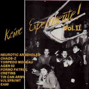 "Keine Experimente! Vol.II" LP 1984/Weird System 010 Torpedo Moskau: Halt´s Maul Agen 53: Flucht Cretins: Treffen bei Verdun Tin Can Army: T.C.A. Volxfront: Ab jetzt Porno Patrol: Strength thru violence Neurotic Arseholes: SWAPOland EA 80: Sie werden nie verstehen Chaos Z: Ein Tropfen im Feuer Neurotic Arseholes: Alles geht weiter Chaos Z: In Gefahr Volxfront: Besatzer raus EA 80: Hoffnungen Porno Patrol: Reality? Torpedo Moskau: Was wollt ihr Agen 53: American dream Tin Can Army: Dead born babies Cretins: Warten auf 1.Auflage (1.000 Stk) in violettem Vinyl + Textbeilage "...das Neue hieran ist, daß die Texte bis auf wenige Ausnahmen die texte von persönlichen Gefühlen und Emotionen handeln, was man besonders an der Entwicklung von CHAOS Z merkt, einst derbe Furzcombo mit ebensolchen Texten; 2 wirklich tolle Sonx, die ich denen nicht zugetraut hätte, ihr neuer Name FLIEHENDE STÜRME paßt auchviel besser zu ihrer Musik. Weiter feiern die Wiederauferstndenen CRETINS Erfolge, besonders der Song "Cretins" muß erwähnt werden, der beste Song der LP. Auch die NEUROTIC ARSEHOLES sind sehr gut, ebenso wie EA80 und AGEN 53, TORPEDO MOSKAU und je ein Song von der TIN CAN ARMY und VOLXFRONT, einziger Ausfall ist die PORNO PATROL (stumpf)." (A.D.S.W. Nr.9, 1985) "Der KEINE EXPERIMENT 2 Sampler ist ein kleines bißchen schlechter als der 1. Los geht´s mit TORPEDO MOSKAU, sehr gut. Es folgen AGEN 53, CRETINS, TIN CAN ARMY und VOLXFRONT, die nichts überdurchschnittliches bringen. PORNO PATROL sind etwas besser und die NEUROTIC ARSEHOLES gefallen mir bisher am besten. EA 80 folgen mit einem sauguten Stück, danach etwas Gemäßigteres: CHAOS Z, sie haben ihren Stil total verändert, mir haben sie früher viel besser gefallen. Herausragend ist auch das 2. Stück von EA 80. Die restlichen Songs sind wieder besser als die vorherigen." (Markus Staiger, Graffiti Nr.2, 02.1985)