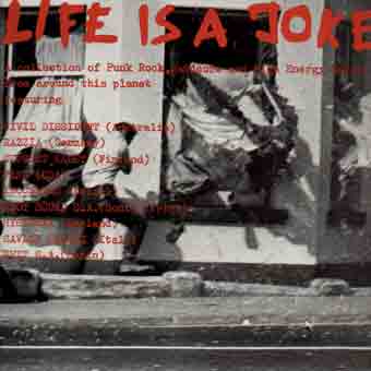 "Life is a joke" LP 1984/Weird System 007 Fang: Red threat Savage Circle: Dogs of war Inocentes: Misera e fome Hysteria: Oblivion Civil Dissident: The buck stops here Riot Squad S.A.: Capital Investment Razzia: Der Söldner Terveet Kädet: Sota (Endless version) Shit S.A.: Fuckin´shit Razzia: Enorm in Form (Manchmal träum ich vom Holzbein) Hysteria: Silent hate Shit S.A.: Revive tu vida Fang: Fun with acid (Ill version) Inocentes: Aprendi a odiar Savage Circle: Shark Terveet Kädet: Message Riot Squad S.A.: N.G.K. Civil Dissident: Mirror of desception 1.Auflage (1.000 Stk) in multicoloured Vinyl + Textinnenhülle.Internationaler Sampler "Auf dieser LP sind 9 Bands aus verschiedenen Ländern mit jeweils 2 Songs vertreten. Gute Mischung. Beste Gruppe ganz klar RAZZIA." (Markus Staiger, Graffiti Nr.1, 11.1984) "Das unheimliche System hat wieder zugeschlagen. Nach dem Motto, erst einen Hamburg Sampler, dann einen BRD-Sampler und nun einen Planet Erde Sampler! Wie wird es weitergehen? Diese Frage überlasse ich getrost den Rockhistorikern und Musikwissenschaftlern. Auf diesem Wek sind 18 Titel von 9 Gruppen aus 5 Kontinenten. Vor allen Dingen soll der Sampler dokumentieren, wie sich Punk seit seiner Erfindung entwickelt hat und wie er weit weg vom Ursprungsland verstanden und gespielt wird. Los geht´s: FANG (USA) enttäuschen obwohl sie "Fun with Acid" propagieren. SAVAGE CIRCLE (Italien) mit guten Ohrwürmern, mehr davon! INNOCENTES (Brasilien) bringen krachigen, schnellen Schrammelpunk. HYSTERIA (England) klingen new wavig, ja fast wie die behäbige Ausgabe von Vice Squad. CIVIL DISSIDENT (Australien) hauen uns schweinegeilen Overkill Trash in die Gehörgänge. RIOT SQUAD S.A. (Südafrika): Ausfall! RAZZIA (BRD) vertreten unser Land großartig! Einmal durch Wolgaschiffer-Chöre und beim zweiten, excellenten Beitrag, durch gequälte Gitarren. TERVEET KÄDET(Finnland): oller Schweinepunk mit Trasheinlagen, schneller, höher, weiter, und dann noch SHIT S.A. (Spanien), die überdrehten Hardcore machen. LIFE IS A JOKE - stimmt genau. Ein bemerkenswertes Teil." (Helmut Westerfeld, Der Skalp Nr.4, 07.1984)