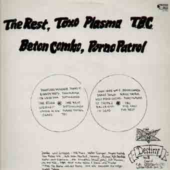 "Muttis muntere Melodei" LP 1984/Destiny II Porno Patrol: Pointless violence Toxoplasma: Bunker Party Betoncombo: Ich liebe dich The Rest: The edge Betoncombo: Steifheit Porno Patrol: Living in sin TBC: Chaos Betoncombo: High oder wat? Porno Patrol: Brake down Toxoplasma: Noch mehr Orden TBC: St.Tropez The Rest: Rausziehn/I´m dead +Textposter "Endlich mal wieder ein guter deutscher Sampler. Fast alle Songs sind super. beste Gruppen: TOXOPLASMA und PORNO PATROL." (Markus Staiger, Graffiti Nr.1, 11.1984) "Diesmal ein echter Hardcore-Sampler, trotzdem kein Trash. PORNO PATROL spielen total guten UK-Hardcore, für mich die beste Band der LP." (Thomas Skubsch, Kabeljau Nr.2, 12.1984) "Gute alternative Produktion!" (Kalle Stille, Vollsuff Nr.2, 1984)