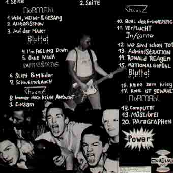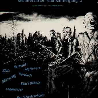 "Soundtracks zum Untergang 2" LP 1982/AGR 08 cAnalterror: Tot gebren Marionetz: Ich bin ein T-Shirt Notdurft: Arschkriecher Einheitsfront Sluts: Anders Notdurft: Amis Normahl: Spießer-Nachbarn Blitzkrieg: Frisch aus England Böhse Onkelz: Hippies cAnalterror: Australien Marionetz: Action Normahl: Depressionen Sluts: Geld cAnalterror: Sie marschieren wieder Neurotic Arseholes: Technischer Fortschritt/Kalte Steine Böhse Onkelz: Religion Notdurft: Süße Heimat Blitzkrieg: Tot geboren Neurotic Arseholes: Razzia +Textbeilage "Aggressiv-Rock als neue Stilrichtung? Wer die Platte nicht`