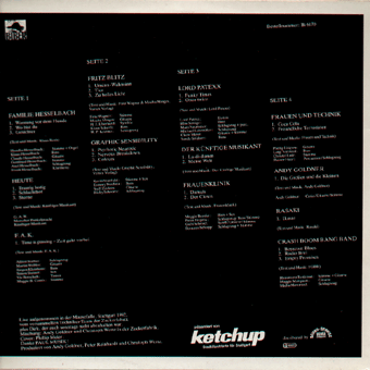"München: Reifenwechsel leicht gemacht" LP 1981/Lächerlich Durchfall: Aggressionen Zero Zero: Onkel aus Sebiria Early Ledder: Is-nt it romantic ZSD: Hau ab Ski und der Rest: Der offene Kreis Marionetz: Teenager Star FKK Strandwixer: Die Nacht der leitenden Reichen Ernst des Lebens: Häschen Die Kleinen Strolche: Alfred ist die deutsche Hure Ameisensäure: Bullen Konsumgeil: Anormal Instant Music: Do not Marionettes: Was kann ich tun Fredy Grosser Band: Manchmal Freiwillige Selbstkontrolle: Hippie Melodie Notes: Numerus Clausus Brechreiz: Du liegst mir im Herzen La Bastard: Arbeitslos Tony Titt and the Torpedos: Blue street Deutsches Froileinwunder: Zu oft im Lipstick Störtrupp: Tote Stadt Reiz des Neuen: Gilda Michael Heinkel: München grüßt Düsseldorf Die 1.Auflage kommt mit dickem Beiheft im LP-Format und mit Klappcover. Die 2. Pressung hat nur noch ein einfaches Cover.
