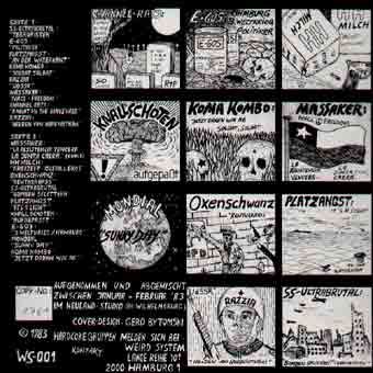 "Keine Experimente!" LP 1983/Weird System 003 Razzia: Ami-Fraß Boskops: Du denkst ZSD: 4er-Tram Buttocks: Hate your neighbour/Feel Alright Upright Citizens: Gift to Europe Blut+Eisen: Alles umsonst Deutsche Trinkerjugend: Kindl-Träume Razzia: Kriegszustand Daily Terror: Leichenberg Upright Citizens: Stand up Deutsche Trinkerjugend: Die Germanen Buttocks: Deutsche raus aus Deutschland SS Ultrabrutal: Terroristen Boskops: Jacutin ZSD: Sex Daily Terror: Ein Kessel buntes SS Ultrabrutal: You could be me Blut+Eisen: W.s.w.u.f. 1.Auflage (1.000 Stk) in klarem Vinyl + Textbeilage. "Hier präsentiert sich die momentane deutsche Hardcore-Auslese. Total geiler Sampler in klarem Vinyl. Eine Band übertrifft die andere. Schade, daß die UPRIGHT CITIZENS zweimal und die BUTTOCKS einmal englisch singen." (Pflasterstein Nr.2, 1984) "Der erste Song kommt von RAZZIA - sehr gut. BOSKOPS danach ebenso überzeugend. herausragend sind ganz klar die UPRIGHT CITIZENS, die wie alle Bands mit 2 Songs vertreten sind. BLUT+EISEN sind etwas schlechter als auf der LP. Im großen und ganze ein wirklich gelungener Sampler." (Markus Staiger, Graffiti Nr.2, 02.1985)