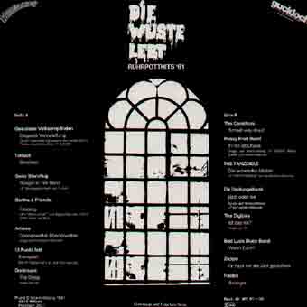 "Die Wüste lebt" LP 1981/Wunschklang Gesundes Volksempfinden: Elegante Verzweiflung Tollwut: Seuchen Geier Sturzflug: Sänger in ner Band Bertha & Friends: Cruising Artless: Donnerwetter Donnerwetter 12 Punkt Fett: Extraplatt Dortmund: The deep The Conditors: Scheiß was drauf Pussy Krull Band: In mir ist Chaos The Tanzdiele: Die lachenden Idioten Die Dschungelband: Jetzt oder nie The Digitals: Ist das nix? Bad Luck Blues Band: Wehrt Euch! Zeppo: Ihr habt mir die Zeit gestohlen Rabbit: Stranger Der Untertitel der Platte lautet "Ruhrpotthits ´81"