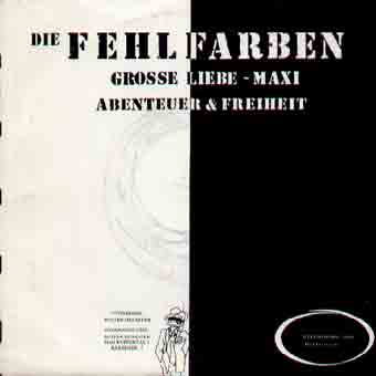 Große Liebe Maxi/Abenteuer & Freiheit Es erschienen "nur" 1000 Stück auf dem hauseigenen Welt-Rekord Label. Dieses wurde im gleichen Jahr noch von EMI/Electrola aufgekauft und die Single (mit gleichem Artwork) nachgepresst. "Fehlfarben: Im Untergrund geht's rund. Und es begab sich zu der Zeit, daß eine Kult-Band aus Düsseldorf mal wieder eine ihrer berühmten Krisen hatte. Ein Teil hatte die Mittagspause gerade überstanden, einem anderen Teil war bei der Deutsch-Amerikansichen Freundschaft nicht mehr wohl, die anderen suchten ohnehin, da fanden sich zusammen: Ein Kneipier, einer von Rank Xerox, ein Gymnasiast, ein Siebdrucker, ein Buchhändler und ein Künstler. So märchenhaft die Gründung der Fehlfarben klingen mag, ungefähr stimmt sie. Janie J.Jones, alias Peter Hein, kam mit dem Gitarristen Thomas Schwebel, früher war der bei S.Y.P.H., von MiPau. Allein der Name des von Hein gegründeten Labels brachte die Lacher auf die Fehlfarben-Seite: Welt-Rekord brachte die erste und bisher einzige Single heraus, auf der sich so etwas wie eine Ska/Neue Welle-Hymne findet ('Abenteuer und Freiheit', auch 'Marlboro Scar' genannt). Die A-Seite war ein fanatisch schneller Ska, eine Version des legendären S.Y.P.H.-Titels 'Ich mag sie', hier 'Große Liebe - Maxi' betitelt. Alles redete nun von den Fehlfarben, war doch ihre Existenz lange wie ein Geheimplan behandelt worden. Kein Wunder, Saxofonist Frank Fenstermacher macht ja auch noch beim Plan mit. Die anderen waren auch keine Unbekannten: Uwe Bauer hatte mit Materialschlacht und S.Y.P.H. getrommelt, und Michael Kemner war seit den frühen Tagen des deutschen Garagen-Punk mit der Deutsch-Amerikanischen Freundschaft zusammen. Bis er sie nach deren ersten Aufnahmen in England verließ. Verblüfft schauten sich Laien und Experten an, als die Fehlfarben zuerst im Ruhrgebiet, schließlich sogar südlich der Mainlinie auftraten. Der flockige Ska-Rhythmus tauchte nur noch ab und an in ihrem Programm auf. Frank: 'Manchmal, bei Zugaben'. Stattdessen ein lockerer Pop-Sound mit witzigen deutschen T exten. Kein Wunder, denn die Macher hießen und heißen Thomas, Peter und Frank. Erinnerungen an Mittagspause werden wach, aber wo bei denen noch Originalität und Spontanität die Oberhand hatten, überzeugt bei den Fehlfarben eine von allen gekonnte Show und Professionalität. 'Üben', verrät Thomas das Geheimnis. 'Nicht-Musiker' Hein klar der faszinierende Mittelpunkt. Aber auch wenn Frank sich mit seinem Sax in Schräglage bringt und Thomas alle paar Sekunden fünf Zentimeter von der Bühne abhebt, dann kommt der Spaß von oben nach unten runter. Sie machen Pop-Musik, die reinste Pop-Musik. Was, stimmt nicht? Beim Telefon-Interview (Frank: 'Wer bezahlt denn das? - Na, denn is' gut') widerspricht Jones meiner Ansicht. Is' U-Musik, Unterhaltungsmusik. Im Untergrund geht's rund. Demnächst bei Karstadt, unter U-Musik wie Untergrund, Unterhaltung, U-Bahn.' Ich bin etwas, aber nicht ganz verwirrt. Die Gerüchteküche kocht. SOUNDS bringt Klarheit in die Wahrheit. Es stimmt, die Fehlfarben wollen zu EMI-Electrola gehen. Stamm-Vater/Mutter des berühmten Pistols-Songs, von Pink Floy d und den Rolling Stones. Fehlfarben wissen also, worauf sie sich mit ihrer ersten LP einlassen. Frank: 'Ja, das wird uns ja immer wieder gesagt, daß wir von Floyd und den Stones leben.' Für die lustigen Musikanten kein Grund sich abzuseilen, sondern zu sagen: 'Wir wollen das als Experiment machen.' Den Status der Clash haben die Fehlfarben nicht, also dürfte ihnen (mir auch) der Spruch vom 'Verräterschwein' egal sein. Endlich, nach Jahren der Arbeit, etwas Geld sehen, ist der eine Grund, es bei EMI zu versuchen. Zu klaren Bedingungen: die Fehlfarben unterzeichnen keinen Künstler-Vertrag sondern einen Vertrag für zunächst eine LP, um dann neu zu entscheiden. Thomas: 'Wir wollen auch keine Vorauszahlungen, an denen wir vielleicht noch jahrelang abzahlen müssen.' Etwas Geld hat's allerdings schon über Düsseldorf geregnet. Für den Verkauf vom Welt-Rekord-Label und die Rechte an ihrer ersten Single gab es jeweils DM 3.000,-. Ein Appel und ein Ei, finde ich. Auch wenn das Label rechtlich nicht geschützt war. In 10.000 Auflage hat die Electrola die Fehlfarben-Single jetzt in die Läden gebracht. Für den Konzern in Köln nicht das einzige Projekt. Auf dem gleichen Label ('Die fragen uns immer, was sie da rauf machen sollen' sagt Thomas) kommen möglicherweise Hannovers Rotzkotz raus. Und im Herbst, sollte der Vertrag zustande kommen, die erste Langspielplatte der Fehlfarben. Fünf Tage waren sie gerade im Studio, um vier Demos aufzunehmen: 'Es war vor Jahren', 'Paul ist tot' (1.Teil), 'Hier und jetzt' und die bereits berühmten 'Kebab-Träume'. Frank: 'Vielleicht in einer Endlos-Version', Thomas: 'Der Hit!'. Häppchenweise kommt ans Licht des Tages, was es mit den Fehlfarben auf sich hat. Janie über die Zeit im Studio: 'Haste schon mal inner Gruppe gespielt, in der keiner Gitarre stimmen kann?' Thomas bleibt am Telefon die Spucke weg. Frank: 'Jaja, das wird Konsequenzen haben. Umbesetzungen. Neuer Saxofonist wird John Coltrane, neuer Gitarrist John McLaughlin, neuer Sänger Al Jarreau. Die Direktive bleibt in den Händen der Original-Fehlfarben.' Wirklich, eine Traumbesetzung... Fehlfarben - unvergleichlich? Frank: 'Schwerlich, vielleicht mit Zappa, nein, den kann man eher mit Male vergleichen. Doch, wir sind vergleichbar mit S.Y.P.H. Die nehmen sich bloß etwas zu ernst. ' Alles drin, find' ich: der Rhein-Geist, der Punk-Geist, der Froh-Geist, der Welt-Geist und der Geld-Geist. Womit bei mir die letzten Zweifel an der Fehlfarben-Zukunft nicht ausgeräumt sind. Thomas beruhigt mich: 'Die Unabhängigen, die sind doch stark genug, die schaffen das schon, auch ohne uns.' Schade, und viel Glück!" (Alfred Hilsberg, Sounds Nr.8/80) "Was soll man zu dieser Single noch groß schreiben...?!Ein genialer SKA-Streich, der einen Riesenspaß macht und manche englische SKA-Bands dagegen v