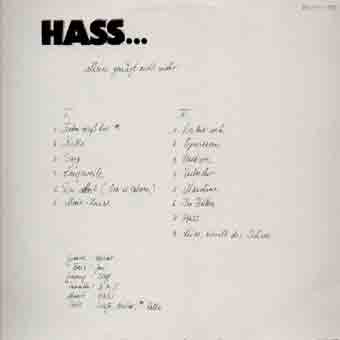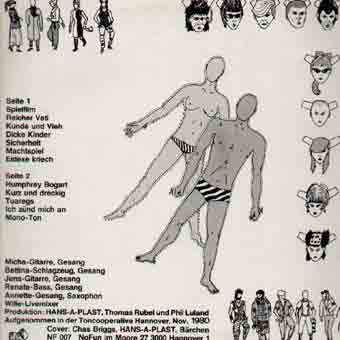 Die zweite Pressung erschien 1980 auf No Fun Records NF 002, wobei auf dem Innenlabel der ersten Seite die Songreihenfolge vertauscht wurde (RocknRoll Freitag mit Lederhosentyp).+Textheft 1. Langeweile und Widersprüche in der deutschen Provinz scheinen eher zu Kreativität anzuregen als in den Punk-Zentren. Aus Hannover, nach Rotzkotz, nun eine zweite LP, die erste von Hans-a-Plast. 2. Hans-a-Plast macht rock-Musik mit konventioneller Besetzung: Schlagzeug, Baß, zwei Gitarren, Gesang. Keinen Punk für Mode-Punks am Freitagabend, keine in Hippie-Nostalgie erstarrten Politsongs. Jedes der zehn Stücke hat eine inhaltliche-textliche Aussage, die von der Musik interpretiert, verstärkt wird. Kein Klischee aus der Rock-Musik ist schade genug, um nicht noch Spaß daran zu haben, Erfahrungen damit zu vermitteln, danach zu tanzen. Hans-a-Plast ist in der Lage, jedem Song eigenständige Akzente zu geben. 3. Die Platte wurde in vier Tagen aufgenommen, zusammen mit der Tonkooperative Hannover. Keine synthetische Produktion, bei der die Power verlorengegangen wäre. Eine kantige, keine überambitionierte, alle Spielfehler ausmerzende Mischung. 4. Hans-a-Plast haben eine politische Platte gemacht: Keine platte Agitation sondern Vermittlung eigener Erfahrungen, Themen von unten für unten: Keine wohlklingende Lyrik, Texte und Musik, die betroffen machen. Selbst wenns um Themen wie Frauen-Unterdrückung geht. Mensch, Hans-a-Plast, bin ich froh, daß es auch ohne Anarchie-Stakkato und ohne Weltschmerz, ohne Oberschüler-Politik geht. Fun und feeling (englisch für Spaß und Gefühl), selbst wenns brennt... Wenn dein Einkaufszentrum, deine Welt vor dir in flammen zusammenfällt / Und du stehst da mit deiner Plastiktüte in der Hand Tiefgefrorenes wolltest du kaufen für heute abend / Du sitzt an deinem Ecktischchen und Dinner zu zweit bei Kerzenschein / Romantik / Du sitzt da und guckst (d)i(h)r tief in die Augen / Romantik, Kerzenschein und vinaigre / Und hinterher ein Fick / ... 5. Es brennt gehört zu den stärksten Stücken, die Anette singt. Und wie die singen kann! Anette hat von allen neuen Bands die beste Temperatur drauf; sie weiß mit Rhythmus ebenso umzugehen wie mit der Tonleiter. Da kommt eine Energie raus, die dich glatt zer-singen kann. Selbst die Studioproduktion bringt das so aufregend rüber wie live. 6. Wer kommt denn da rein und meint bemerken zu müssen, das höre sich wie Nina H. an? Die habe ich doch gerade ihr Abschiedskonzert in London geben sehen. Exhibitionismus und Engagement sollte besser nicht verwechselt werden. 7. Hans-a-Plast ist eine der wichtigen deutschen Bands. More fun from Hannover! [...] (Alfred Hilsberg, Sounds Nr.11/79)