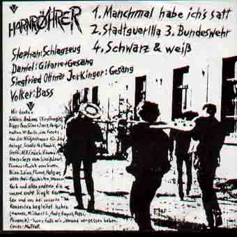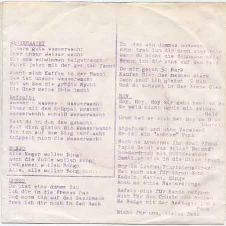Erstpressung (nummerierte 500er Auflage) mit anderem Vorder-und Rückcover. Zweitpressung mit der Aufschrift P 1980 2.Auflage auf der Coverrückseite. Drittpressung mit neuem Cover (geometrische Formen) und der zweite Song auf der A-Seite erhält mit Steh auf einen neuen Namen. Ansonsten beide Daumen hoch, trotz (oder gerade wegen) der abenteuerlichen Aufnahmequalität ein echter Punk-Klassiker mit vier Perlen. "Hörenswerte Hamburger Gruppe mit ihrer ersten EP, vieles klingt zwar noch sehr konventionell, an die alten Sachen wie TON STEINE SCHERBEN erinnernd und das SKA-Stück konnte ich auch nicht erkennen. Trotzdem ne anhörenswerte Platte, vor allem wegen der Texte." (Bobby Blitzkrieg, Alles Tot Nr.6, 1980)