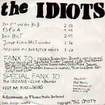 Die Zweitpressung hatte dann ein gelbes Logo. Der Sänger spielt heute bei den Phantoms Of Future. "Gute EP von der Gruppe aus´m Pott. Ein bereits vom H´ART Sampler bekanntes Stück "S04 und der BVB" in noch besserer Version. EP ist voll gut. Fällt auf!" (Kalle Stille, Vollsuff Nr.2, 1984) "THE IDIOTS kommen aus Dortmund und haben ihre EP in eigener
