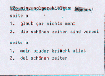 HOLGER KIELGAS (Bremen) : "Neues" 1982/Heimat hc2 Sehr konfuse Cassette die nicht mit der genialen Single mithalten kann. Trotzdem interessant. |