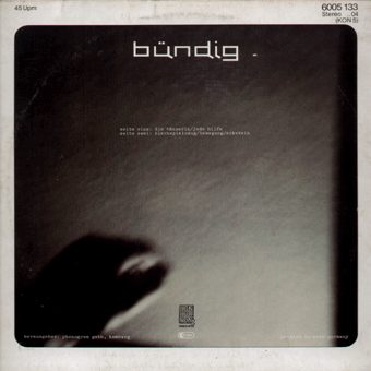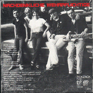 NACHDENKLICHE WEHRPFLICHTIGE:"Politik für junge Leute" 7" 1980/ZickZack ZZ8 Hundert Mann/Er steht im Tor-Wenn es sein muß/Das Traumendspiel-Freunde müßt ihr sein: Hrubesch/Schwierigkeiten-Gerittene Manifeste/Arbeitereinheitsfrontlied Ein sehr frühes ZickZack-Projekt mit vielen Szenegrößen wie Frieder Butzmann, Diedrich Diedrichsen, FM Einheit, Bettina Köster und Albert Oehlen. 1985 erschienen auf dem ZickZack-Sampler "Kirche der Ununterschiedlichkeit" noch 2 Songs. "Nachdenkliche Wehrpflichtige (ZickZack). D.D.'s Superstargruppe: FM Einheit (= Mufti von Abwärts), Frieder Butzmann, Albert Oehlen (Falsche Freunde, The Forcefeds, Acapella Now), Bettina Köster (Mania D.), Isabell und Nicola bringen die happigste EP dieses Haufens. Sehr bemerkenswert und schwer zu be-/umschreiben. 'Politik für junge Leute' ist ein kleines, aber umfassendes Patchwork aus Zeitgeschehen, Hebbel-Zitaten ('...aber so ist auch der Mensch, fürcht ich, ein Schmerz nur in Gott'), Sportbegeisterung ('Klein, klein in der Abwehr, was soll das?'), deutschem Schlagergut ('Er steht im Tor, Tor, Tor...') und Privatismen, die sich in ziemlicher Ketik abwechseln, aneinanderreihen, überlagern. Albert, Frieder und Bettina blasen zu diesem Panoptikum wie die Schiffe im Hafen freie Saxofonphrasen, Mufti trommelt den karikierten Marsch 'Hundert Mann und ein Befehl, und ein Krieg, den keiner will''. Ziemlich souverän, wirklich was besonderes. (Hans Keller, Sounds Nr.9/80) "Ein Produkt vom Hamburger ZickZack Label . Die Scheibe ist ein Sessionprodukt der Avantgardeprominenz der BRD. Dabei Musiker von MANIA D., ABWÄRTS und Sounds-Schreiber Diedrich Diedrichsen als Sänger. Herausgekommen sind sehr bizarre Klänge von denen ich bis heute noch nicht richtig weiß, was ich davon zu halten habe. Die EP besteht aus 5 kurzen Stücken, jedes gespickt mit viel Disharmonien, Hebbel-Zitaten und manch anderen akustischen Überraschungen. Eine ernsthafte Abhandlung über die Politik ind der (Rock) Musik? Wohl kaum, aber als bloße Verarsche will ichs auch nicht abtun, obwohl beim "Arbeitseinheitsfrontlied" manche Mitwirkende kurz vorm Lachkrampf zu sein scheinen...! Vielleicht ist es einfach einSuchen nach neuen Klangmöglichkeiten, neuen Formen, wobei ich mir über den Inhalt aber nicht ganz im Klaren bin. Sieht mans aber alles nicht so tierisch eng, so kann die Platte viel Spaß machen, da sie auch sehr witzig ist, besonders "Das Traumspiel", ein Simultankommentar eines BRD-Italien Fußbalspiels." (Alles Tot Nr.8, 1980)