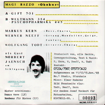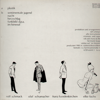 KEINE AHNUNG (Wörth):"s/t" LP 1983/Passiv 001 Plastik/Sentimentale Jugend/Nacht/Herzschlag/Funkbild/d.p.a./Im Himmel "Das erste Vinyl-produkt des Synthi-Quartetts aus Wörth am Rhein: eine Mini-LP oder Maxi-EP mit 30 Minuten Spieldauer. Auf der B-Seite 5 Stücke bei 33 upm, Elektronik-Pop in guter Abwechslung präsentiert: "Sentimentale Jugend" ist ein schnelles Stück, das nach einer Mischung aus DAF und SUICIDE klingt. Danach das langsamere, softere "Nacht". "Herzschlag" ist ein ähnlicher melancholischer Song (mit Flöte). "Funkbild D.P.A." zeigt die experimentellere Seite KEINE AHNUNG´s, geht in Richtung T.G. etwa. "Im Himmel" bildet den, wieder etwas flotteren, Abschluß der B-Seite, erinnert mich etwas an TUXEDOMOON (oder liegt´s nur an der Geige?). Auf der A-Seite nur ein Sück, 7 Minuten lang: "Plastik", der Titel sagt schon (fast) alles über den Inhalt des Textes aus - die tanzbaren Klänge erinnern mich ein bißchen an KRAFTWERK...Gesamthaft biete die Platte nichts Außergewöhnliches oder umwerfend NEUES...aber sie ist sehr schön und gut! Und jedem Techno-Pop-Fan ohne Zweifel zu empfehlen! Übrigens in hervorragender Qualität!" (Armin Hofmann, Lautt Nr.4, 1983)