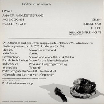 KOPP, HERMANN (Karlsruhe):"Pop" LP " 1983/Passiv 003 Himmel/Amanda am Nudistenstrand/Mondo Zombie/Paul Getty's Ohr/Gemini/Belle De Jour/Fleisch/Nein, ich bereue nichts Mit Textblatt.