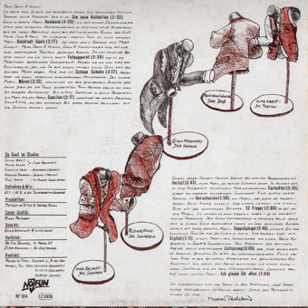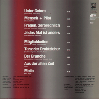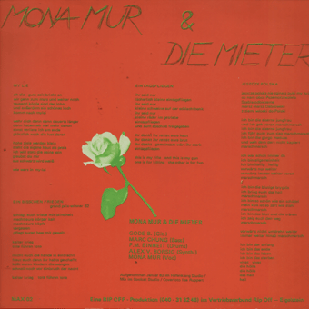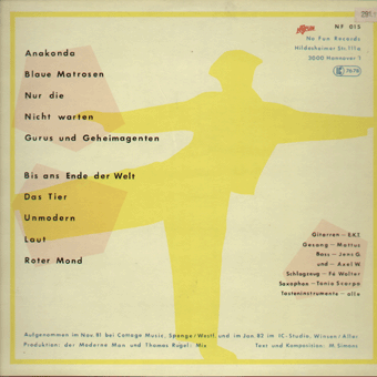 MYTHEN IN TÜTEN (Hannover):"Jedes Mal ist anders" LP 1983/No Fun Records NF021 Unter Geiern/Mensch + Pilot/Fragen, zerbrechlich/Jedes Mal ist anders/Möglichkeiten/Tanz der Drahtzieher/Der Branche/Aus der alten Zeit/Meile Mit bedruckter Innenhülle. "MYTHEN IN TÜTEN - Jedes Mal ist anders (NF 021). Lange schon vor dem brackigen Überschwappen der Neuen Deutschen Welle machten MYTHEN IN TÜTEN aus Hannover bereits Schlager über Schlager; von der sarkastischen Voraussicht der fünf Musiker künden die LP 'Die neue Kollektion' (NF 014) sowie die zu Liebhaberpreisen gehandelten Single-Schallplatten 'Lady Di' (NF 107) und 'Liebe im Funkhaus' (NF 109). Doch so wie sich die Zeitläufe ändern, so ändert sich auch die Musik der Mythen. Nicht jedem gefällt die jüngste bundesdeutsche Wende, und sensible Künstler wie die Mythen wissen durchaus beredt Kontraposition einzunehmen. Wenn auch der brilliante Wortwitz aus jeder Textzeile blinkt, läßt sich doch wohl sagen, daß MYTHEN IN TÜTEN mit ihrem neuen Album JEDES MAL IST ANDERS einen eindeutigen und ehrlichen Standpunkt zum aktuellen Tagesgeschehen bezogen haben, wiewohl sie sich natürlich nicht einer bestimmten, parteipolitischen Couleur zuorden lassen. Ihren neuen Stücke spiegeln, wie sie selbst sagen, 'ein Lebensgefühl, das auch durch Irritation und Bedrohung geprägt ist'. So etwa in dem Song 'Möglichkeiten', in dem E.Winschetti und L.Worat eine geradezu kafkaeske Verhörsituation schaffen. Überzeugend auch die Darstellung von übermächtiger Gewalt in 'Mensch+Pilot' von Saxofonist I.Erlhoff. R.Klose und Th.Rugel bringen mit 'Meile' ein eindringliches Bild des anonymen Großstadtdschungels. Zu den heiteren Stücken - im Sinne der MYTHEN IN TÜTEN - schließlich gehören der Opener, das Karl Mayeske Hörbild 'Unter Geiern', sowie die Live-Aufnahme 'Aus der alten Zeit' mit der Gastsängerin Marion Pechstein (auch dies ist mittlerweile fast eine 'Tradition' der Mythen, man erinnere sich nur an Angelika Maiworm - auf der ersten LP - und Tiny Trash - auf der zweiten Single). Friedlich und ausgeglichen ist dagegen der Titelsong, JEDES MAL IST ANDERS. Zum permutativen Text beweist hier erneut Bassist J.Kirtschig sein subtiles Einfühlungsvermögen. Anspieltips: Unter Geiern, Möglichkeiten, Jedes Mal ist anders, Der Branche." (No Fun Records, Presseinfo 1983) "Mythen in Tüten = eine handvoll intelligenter Rettiche? Es ist nicht einfach, etwas Positives über die Mitglieder von Mythen in Tüten zu schreiben. Sie haben so wenig Appeal. Einige von ihnen sehen recht gut aus, aber so richtig häßlich ist keiner. Sie sind nicht von Ausschweifungen gezeichnet, sie sind nicht schick. Man sieht sie bisweilen in den teuren Clubs, aber sie wirken so wenig spektakulär dort wie die Getränkekarte. Sie sind zuvorkommend und höflich. Sie sind um die dreißig. Sie wirken sehr klug. Sie haben alle Trotzki, Adler und Cooper gelesen; sie zitieren sie nie. Im Gespräch sind sie bescheiden und ruhig. Sie lassen erkennen, daß man selbst viel besser Bescheid weiß als sie. Das macht sie so unerträglich. Die Mitglieder von Mythen in Tüten heißen Ingo Erlhoff, Jürgen Kirtschig, Rüdiger Klose, Emilio Winschetti, Lutz Worat. In alfabetischer Reihenfolge. Sie spielen Schlagzeug, eine Reihe von Blasinstrumenten, Tasteninstrumenten, Gitarren und Baßgitarren - einige beherrschen mehrere Instrumente, andere kaum eins. In ihren Songtexten kommen ungebräuchliche Wörter in ungebräuchlichen Zusammenhängen vor. Das ist manchmal komisch, manches Mal erst etwas später. Ich werde von der Plattenfirma dafür bezahlt, einen möglichst wirksamen Informationstext über Mythen in Tüten zu verfassen. Die Bezahlung ist gut, aber die Aufgabe sehr undankbar. Ich habe mich mit den fünf Musikern einige Male getroffen, ich habe mir Auftritte angeschaut, ich war bei Plattenaufnahmen im Studio dabei. Sie scheinen sich seit einer Ewigkeit zu kennen; sie reden miteinander in einer bilderreichen Künzelsprache, die niemand Außenstehender versteht. Doch sie sind kein Geheimbund, keine Kommune, bilden keine Clique. Ich glaube nicht, daß sie einander mögen. Sie haben bislang eine LP und zwei Singles veröffentlicht mit Schlagern über Schlager. Im Frühjahr '83 erscheint ihre zweite Langspielplatte, 'Jedes Mal ist anders', mit Stücken über Gewalt, Gefahr und Einsamkeit. Es ist ein kühles und menschliches Album geworden, dem genausowenig Verkaufserfolg beschieden sein wird wie ihren früheren Veröffentlichungen. Die Platte ist streckenweise von einem schrulligen Witz, der an Hugo Ball und E.E.Cummings denken läßt; das spricht nicht gegen Mythen in Tüten, sondern nur für ihr Unvermögen, in verkaufsträchtigen Bahnen zu denken. Ich würde gern mehr nette Dinge über die Mythen schreiben, was für brilliante Musiker sie sind, wie witzig es ist, mit ihnen zu plaudern, wie sexy der Sänger aussieht. Doch wenn ich ehrlich bin, kann ich nur sagen, daß Mythen in Tüten mich verunsichern." (Esther Levkovitz, Presseinfo 1983)