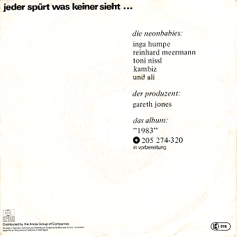 NEONBABIES (Berlin):"I Don't Want To Loose You " 7" 1980/Resco 66.10190-01 I Don't Want to Loose You/Baby, You Are.../Eisenleer/Blaue Augen Neben Inga Humpe spielte zu Beginn noch ihre Schwester Annette Humpe (Ideal) mit, die später von Petra Mikolaijczak (1. Futurologischer Kongreß) ersetzt wurde. Hier gibt's auch die erste Version des späteren ndW-Hits 'Blaue Augen'. "Die Neon Babies (ohne Label) scheinen beim Hören der A-Seite eher was für die Popper-Generation zu sein. Englische Texte zu englisch klingender Musik. Aber diese Berliner Band hat doch mehr Power und Rauhheit als z.B. die Pretenders, die ja in dieser Marktlücke ungewöhnlichen Erfolg haben. Die B-Seite mit deutschen Versen bringt die tolle Stimme von Sängerin Annette erst richtig rüber. Neon Babies - neue deutsche Disco-Musik?" (Alfred Hilsberg, Sounds Nr.7/80)