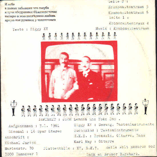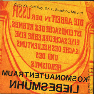 KOSMONAUTENTRAUM (Hannover/Hamburg) : "Immer laut hören" 7" 1980/Eigenproduktion MJ 91223 Kosmonautentraum/Alltag/Der Derutsche Kosmonautentraum (Eigenlabel). Ziggy XYs Solo-Platte, ohne den Modernen Mann. Kid P.: Ziggy XY ist ein Idiot (Bewertung 0 = hat das Geld nicht verdient). Alfred Hilsberg: Armer Ziggy. Hannover (96?) kann einen ganz schön fertigmachen, aber du wirst auch andere Antworten wissen. Keine Wertung. (Kid P. und Alfred Hilsberg, Sounds Nr.10/80) "Moderne Man als Kosmonauten in schwindelnden