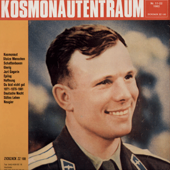 KOSMONAUTENTRAUM (Hannover/Hamburg):"Juri Gagarin" LP 1982/ZickZack ZZ100 Kosmonaut/Stolze Menschen/Schattenboxen/Gierig/Juri Gagarin/Epilog/Hoffnung/Du bist nicht gut/1971-1976-1981/Deutsche Nacht/Süßes Leben/Neugier 1.Auflage enthält zusätzlich noch das Comic-Heft "Nick der Kosmonaut" "Kosmonautentraum schaffen klare Verhältnisse. Keine Spielerei mit Pop. Kein Liebäugeln mit der Masse. Denn Erfolg verdirbt bekanntlich...nicht nur den Charakter. Ich möchte annehmen, daß dieser dumme Spruch nicht der zwingendste Grund für die Hannoveranrer war, sich so konsequent gegen die neudeutsche Poppigkeit abzusetzen. Denn Kosmonautentraum haben Klasse. Und Klasse steht für sich. Natürlich auch oft genug allein und genau deshalb werden Kosmonautentraum es auch schwer haben. Die Masse will Pop, Kosmonautentraum das Gegenteil. Dabei ist ihnen Rhythmus nicht fern, ganz und gar nicht. Die Band ist übermäßig druckstark, die Trommeln knallen, Ziggy Yx läßt den den Kosmonauten tanzen. Gleich zu Anfang allerdings ein bißchen viel von DAF. Warum nur immer wieder dieser Virus? Ein Minuspunkt, ein kleiner. Es geht weiter mit Tiefgang und Vielfalt. Synthesizer spielen Nebenrollen. Es gibt Trompeten, Xylophon und Wasserspiele. Ziggy Yx ist zentral, ein Klavier der Farbklecks. Kosmonautentraum grenzen sich ab. Wer noch Vergleiche in Hannover sucht, liegt falsch. Die Band ist zwar deutsch, aber nicht modernistisch, dafür schwerwiegend. Vor allem Ziggys Texte liegen außer Reichweite, meistens... 'Wir tragen Hosen von toten Frauen, Küchenschaben klettern an uns hoch'...Ich weiß nicht? Dann schon eher 'Gierig', die greifbare Seite der Kosmonautenfantasie: 'Ich bin gierig auf Torten, Leder, Mumien und Super 8, Hektik, Fleisch und Ingrid Caven, Trümmer und den lieben Gott. Betäubung und der letzte Schrei. Ich bin gierig auf Dilletanten, Muskeln und Mehlsuppe, Wahnsinn, Ritter, Sex und Nico. Würmer und die letzte Hungerkur, Wunder und deine Schuld...' Kosmonautentraum machen es dir nicht leicht. Aber eine Band von Format kann Ansprüche stellen." (Peter Sanders, Musikexpress Nr.5/Mai 1982) "Mit Trompeten in die Idylle. Kosmonautentraum.
