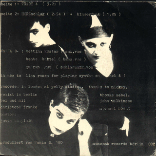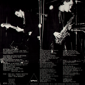 MUTTERFUNK (Düsseldorf):"s/t" LP 1981/Schallmauer SCHALL 006 Jodymaderadiotelegrafo/Jody Mutterfunk/Deutsche Scham/Schwimmen Teil 1/Schlimmer Tag für Ute/Tanz Marta/Schwimmen Teil 2 Mit Ralf Albertini (Krupps). "Mutterfunk (Schall 006). Freunde der Nacht (Schall 008). Diese beiden Platten haben nichts gemeinsam, außer daß sie beide aus düsseldorf kommen, beide als Maxi-EPs laufen und beide auf Düsseldorfs geheimen ZE-Label Schallmauer rausgekommen sind. Das heißt genauer: Düsseldorfs potentiellem ZE, denn bisher hat die Schallmauer vorwiegend die Freunde des aufgerauhten Entertainments angesprochen. Sowohl Mutterfunk als auch die Freunde der Nacht brechen teilweise mit dieser Tradition. Speziell der Mutterfunk, Ralf Albertini und Axel Grube gehören wohl zu den vielversprechendsten Entdeckungen des Labels. Judy Mutterfunk kriecht als eine der letzten vertretbaren Möglichkeiten, Blues in zeitgemäßes Gefühl zu überführen, subtil unter dem Teppich hervor. Die Stücke, aus denen Albertinis angriffslustiges Saxofon hervorbricht, gehen über eine biedere Kopie der DAF (Zitat: SPEX) weit hinaus, der Gesang holpert allerdings noch etwas. Jedenfalls ist die Platte ein Lichtblick oberhalb der gepreßten Langeweile modernistischen Deutschtümelns [...]." (Xao Seffcheque, O.R.A.V., Sounds Nr.1/Januar 1982)
