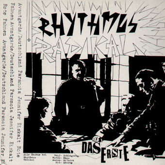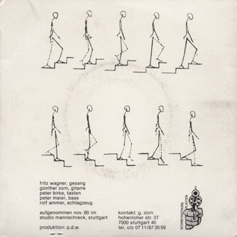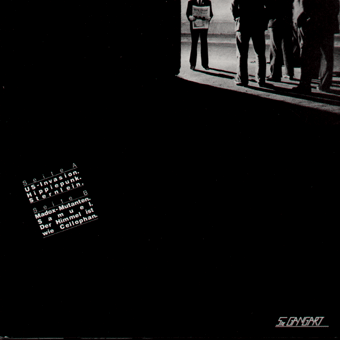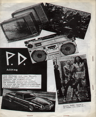 PERMUTATIVE DISTORSION (P.D.) (Mainz):"Alltag" 7" 1980/Eigenproduktion 76.10310 Schweigende Mehrheit/Ein Besuch im Einkaufszentrum-Moderne Muzak/Heimwerker-Alltag/Hauptbahnhof "Eins, zwei, drei, vier, zisch, krach, blubber - das aufregendste Band dieses Jahres habe ich gehört: von den Rhein-Main-Gruppen sollte hoffentlich bald mehr zu hören sein. Besonders gefallen haben mir [...] P.D. aus Mainz (Ex-Messehalle). Joachim von P.D. schreibt: ' Statt Schlagzeug jetzt Joachim Pense (Synthi, Tapes, Cello)'. Für Ende Mai/Anfang Juni planen die Avantgardisten eine Tour, für die noch Termine in Norddeutschland frei sind. Und Ende Juni steigt 'Wahrnehmungen 80', der 'Versuch, die üblichen Rezeptionsformen aufzuknacken'. Im Gespräch sind eine neue Gruppe namens Kurzschluß, P.D., Der Plan und - nur Mut! - Minus Delta T." (Alfred Hilsberg, Sounds Nr.5/80) "Die Rhein-Main-Wellen schwappen fast über die Ufer: [...] von denen P.D. als erste eine Platte, die EP 'Alltag', herausbringen. Wer 'Alltag' umsonst haben will, mache sich mal bitte Gedanken über die Bedeutung von P. und D. Die beste Deutung wird - unter Ausschluß des Rechtsweges, versteht sich, prämiert. Einsendungen an: Joachim Stender, Am sonnigen Hang 50, 65 Mainz 1." (Alfred Hilsberg, Sounds Nr.6/80) "'Besser als Iggy', kommentierte Frank Fenstermacher (Plan/Fehlfarben) den kurzen Auftritt von Joachim, Sänger bei P.D., beim Festival des Verbandes Deutscher Studentenschaften (doch, doch!) in Mainz. Die P.D.-Single ist auch raus [...]. Der vorläufer von P.D. - der Preisträger des Preisausschreibens vom letzten 'neuesten deutschland' wird in der nächsten sounds bekanntgegeben - heißt bekanntlich Messehalle, kommt ebenfalls aus Mainz und ist mindestens genauso weit vorn. Da mein Kassettenrecorder lieber streikt als läuft, konnte ich nur Bruchstücke von der improvisierenden Gruppe hören, die bei Live-Auftritten mit visuellen Effekten arbeitet." (Alfred Hilsberg, Sounds Nr.7/80) "Die Gewinner des Preisausschreibens 'Was bedeutet P.D.?' [...] sind gefunden. Es sind Lisa Eisele aus Köln mit 'Public Defense'; H.Schroer aus Velbert mit 'Plastic Death'; Klaus D.Mencke aus Jesteburg mit 'Public Damage' (nicht ganz so gut wie Lösung 1, denn 'so offensichtlich imitieren wir PIL nicht, oder?' fragen P.D.). Dann Holger Räther aus Karlsruhe mit 'P.D. = Zahltag' und A.Dels aus Düsseldorf mit 'Punk Desolat'. Einen Sonderpreis für lange, mühevolle Literaturarbeit erhält Wolfgang Wiggers aus Ottersberg. P.D. planen für Ende August die Aufnahmen der ersten LP.' (Alfred Hilsberg, Sounds Nr.9/80) "P.D.: 'Alltag'. Wenn überhaupt noch eine 'Musik', dann eine, die stärker mit den Verkehrs- und Kommunikationsmitteln, dem technischen Display des modernen Alltags interferiert... Die Erfahrungen, die P.D. mit ihren Geräuschstrukturen vermitteln wollen sind nicht neu. Es kommt immer darauf an, wohin der einzelne Hörer die Akzente beim 'Musik'-Begriff setzt, um solche Platten einzustufen. Alltags-Geräusche und der monochrome Gebrauch verschiedener Instrumente. Ich kann dem mit dem gleichen Interesse zuhören wie kochendem Wasser in meinem Tauchsiedertopf (weder negativ noch positiv gemeint). Hoffe nur, daß die Cover-Zitate nicht als Evangelium aufzufassen sind." (Hans Keller, Sounds Nr.9/80) "[...] Anders sieht es da noch in der Mainzer Szene aus, wo ein gewisser Zusammenhalt sich einfach aus der provinziellen Umgebung und dem daraus resultierenden gemeinsamen Kampf ums Überleben ergibt. Zudem haben die meisten Gruppen eine gemeinsame Tradition, die insbesondere mit der Geschichte der Gruppe Messehalle zusammenhängt. Messehalle, die erste Gruppe der neuen Welle in Mainz, hatte nämlich die besondere Eigenschaft, sich vor oder nach jedem Auftritt zu spalten. Dieser Zellteilungstrieb, der einerseits Messehallle selbst ins Mittelmaß abgleiten ließ, führte andererseits zur Entstehung zweier wichtiger Mainzer Gruppen, P.D. und Schwarzes Loch. P.D. ist die erste Konzeptgruppe im Rhein-Main-Raum: Hintergrund der P.D.-Musik ist der Versuch, 'Alltag' durch Synthese von Geräuschen (über Tapes und vielleicht künftig auch über selbst konstruierte Soundmaschinen) und Klängen (Instrumenten) in musikalische Strukturen zu übersetzen. Die P.D.-Stücke entstehen daher als Soundkonzepte, innerhalb deren den einzelnen Instrumenten mehr oder weniger Platz für Improvisationen bleibt. Die Gruppe muß zur Zeit den Verlust ihres Kernmitglieds Jochen Pense (Cello, Synthi, Tapes) verkraften, der für ein Jahr nach England geht, zu den Aufnahmen der geplanten LP jedoch noch zur Verfügung steht. Der Kern von P.D. besteht damit nur noch aus zwei Mitgliedern, die jedoch ggf. durch befreundete Musiker anderer Mainzer Gruppen unterstützt werden. Im Gespräch ist außerdem die Mitwirkung von P.D. an einem internationalem Avantgarde-Sampler, u.a. mit Half Japanese und/oder anderen San Francisco-Gruppen, was, nach der EP 'Alltag' und der geplanten LP die dritte Schallplattenveröffentlichung der Mainzer Gruppe wäre. Durch den Einfluß von P.D. und Messehalle sind in Mainz weitere Gruppen entstanden, die zumeist ebenfalls in der gleichen Richtung arbeiten. [...]" (Joachim Stender, Sounds Nr.9/80) "Hör sie dir an! Meine Meinung: Mir gefällt vor allen Dingen der liedhafte Charakter auf solider Calypsogrundlage." (CB, Sabotage Nr.1, 1980)