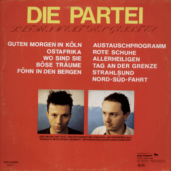 DIE PARTEI (Limburg):"La Freiheit des Geistes" LP 1981/Tausend Augen 20011 Guten Morgen in Köln/Ostafrika/Wo sind sie?/Böse Träume/Föhn in den Bergen/Austauschprogramm/Rote Schuhe/Allerheiligen/Tag an der Grenze/Strahlsund/Nord-Süd-Fahrt Mit Walter Dahn und Tom Dokoupil (The Wirtschaftswunder, Die Radierer und Siluettes 61). "Während Wirtschaftswunder in der Versenkung bleibt, hat Tom Dokoupil, nicht untätig, gleich zwei neue Platten auf den Markt geworfen. Eine ungeheuer sympathische Erscheinung, wie ich finde, da ich schon nach Durchhören einer Plattenseite Lust auf mehr hatte. [...] Die Partei sind Tom Dokoupil und Walter Dahn und, wie schon angedeutet, beinah die fortsetzung der Siluettes, nur instrumental. Das heißt nicht, nicht ganz so ohne Geräusch und Wortfetzen gehts offenbar nicht. Macht aber nichts, hier stören sie kein bißchen. LA FREIHEIT DES GEISTES ist durch und durch gelungen. Dokoupil und Dahn haben es geschafft, eine fröhlich lockere Tanzplatte zu machen, die weder Funk noch DAF nötig hat. Vorwiegend Warmtöne, mechanisch schnelle, kaum wahrnehmbare Rhythmusbox, sparsame Gitarren, hin und wieder Saxofon und mal Trompete. Darüber liegen Themen, kleine Melodien, so simpel wie einprägsam, manchmal an Yello erinnernd. Den Assoziationen sind keine Grenzen gesetzt. Damit das auch jeder versteht und die Partei richtig einschätzen kann, haben die beiden wieder ein Filmzitat zur Hilfe genommen: Unsere wahre Größe ist die Freiheit des Geistes... Ich möchte zu gern wissen, woher das stammt." (Thomas Buttler, Sounds Nr.1/Januar 1982)