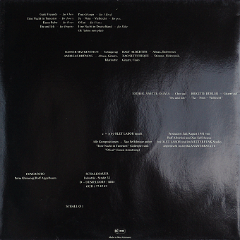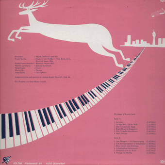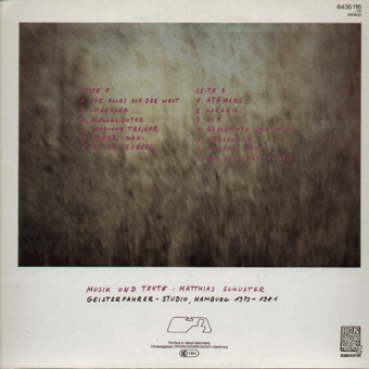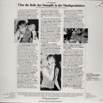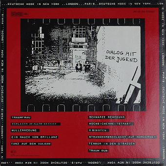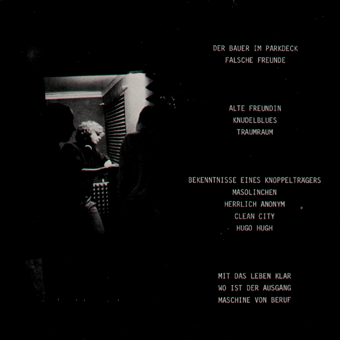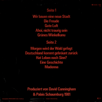PALAIS SCHAUMBURG (Hamburg):"s/t" LP 1981/Phonogram 6435139 Wir bauen eine neue Stadt/Die Freude/Gute Luft/Ahoi, nicht traurig sein/Grünes Winkelkanu/Morgen wird der Wald gefegt/Deutschland kommt gebräunt zurück/Hat Leben noch Sinn?/Eine Geschichte/Madonna Mit allen Texten auf der Innenhüllen, sehr amüsant sind z.T. die englischen Übersetzungen. "[...] Den Schritt zur Industrie haben Palais Schaumburg bereits getan. Ihren Start hatten sie mit mehreren Singles auf dem Hamburger Zick-Zack-Label im Rip Off-Vertireb. Ihre erste Langspielplatte ist im November bei der Phonogram erschienen und hat binnen drei Wochen schon 10.000 verkauft. Holger Hiller, Sänger bei Schaumburg, sagte an anderer Stelle als Begründung für den Schritt zur Industrie, die Band wolle möglichst viele Leute erreichen. Dazu Thomas Fehlmann, Synthi-Spezialist der Gruppe: 'Wichtig ist, daß wir immer noch unabhängig sind. Wir haben denen unser Band vorgespielt, als alles schon fertig war. Da lief überhaupt nix vorher. Da ist kein Typ ins Studio gekommen und hat gesagt: 'Macht das so und so.' Wir haben die Platte so verkauft wie sie war. Wir haben auch im Vertrag keine Klausel, die denen irgendeine mitsprache ermöglichen würde. Andererseits gibt es einen fixen Soll-Plan. Die firma hat eine Option für eine Platte, die nach unserem Gusto produziert wird, ob denen das gefällt oder nicht.' [...]" (Thomas Buttler, Musikexpress Nr.1/Januar 1982)