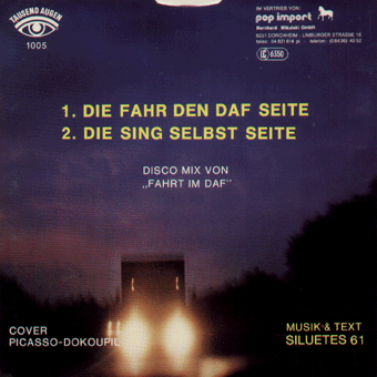 SILUETES 61 (Limburg):"Fahrt im DAF" 7" 1981/1000 Augen 1005 Fahrt im DAF/Fahrt Im DAF (Instrumental) "Sektion: DAF und die Folgen. Wieder der Name Dokoupil. Jener hat seine Siluettes 61-Parodie von DAF als Single (gutes Cover) ausgekoppelt und eine unbesungene B-Seite mit der gleichen Musik hinzugepreßt, die Sing selbst-Seite, bei der sich jeder selber über DAF hermachen darf. Fahrt im DAF (Tausend Augen/Pop Import)." (Diederich Diederichsen, Sounds Nr.1/Januar 1982)