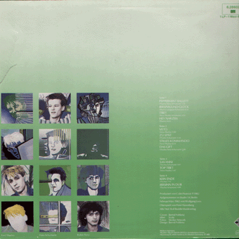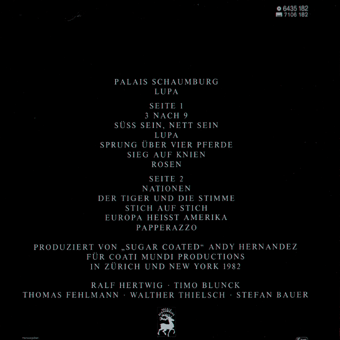 PALAIS SCHAUMBURG (Hamburg):"Lupa" LP 1982/Phonogram 6435182 3 nach 9/Nett sein/Lupa/Sprung über vier Pferde/Sieg auf Knien/Rosen/Nationen/Der Tiger und die Stimme/Stich auf Stich/Europa/Papperazzo "Ändern wird sich auch einiges bei den Hamburgern Palais Schaumburg. Nach der Trennung von Holger Hiller sind sie gerade dabei, neue Musiker einzuarbeiten. Aus diesem Grunde mußten sie auch die für April/Mai geplanten Konzert- und TV-Termine absagen." (Musikexpress Nr.5/Mai 1982) "Freund oder Feind? Die Band sitzt zwischen den Stühlen. Indem sie das 'typische Deutsche' aus Sound und Stil zu verbannen suchen, kam für Schaumburg die symptomatische Krise. Von der 'hip'-Liste gestrichen, sind sie zwar dabei, ein breiteres Publikum zu gewinnen. Aber das muß erst einmal verdaut werden... Europa ist Amerika, Asien ist Afrika - Amsterdam ist Berlin. Der Spaziergang durch Amsterdam am Nachmittag vor dem Palais Schaumburg-Konzert im 'Flora' führt mich wie durch ein Wunder an der Straßenschlacht zwischen Hausbesetzern und der Polizei vorbei. Während abends dann die Hamburger in einem zur Groß-Disco umgestylten Kino den Holländern zeigen, wie sich Tanzmusik aus Deutschland auch anhören kann, fliegen Steine in die fensterfronten der Banken. Palais Schaumburg ist die andere große Sache an diesem Abend. Ihre neue LP LUPA wird als frisch eingetroffen auf einer Schiefertafewl vor einem kleinen Plattenladen angepriesen. Im Zeitschriftenladen nebenan ist Schaumburg als Titelbild der holländischen Musikzeitschrift 'Oor' gegenwärtig, daneben Andy Warhol's 'Interview' vom Oktober, wo Palais Schaumburg als bemerkenswerte deutsche Funk-Band empfohlen wird. Ein paar Schritte weiter verwechselt ein Hund die riesige Teppichrolle vor dem Dekorationsgeschäft mit einem Baum... Nach Mathilde Santing und einer kurzen Instruktion in Rap von Kurtis Blow und seinem Deejay Dave Lee Dee betreten Palais Schaumburg die Bühne als Stars aus dem Ausland. Die Distanz zu einem Musiker ist meistens respektvoller, wenn man ihn nicht jeden Abend in seiner Stammkneipe trifft. So geht von den Musikern hier am ersten Abend der Tour eine Menge Souveränität aus, die ihnen später, vor heimischen Publikum in Hamburg, dann doch zeitweise fehlte. Timo Blunck, exaltierter Springer am Baß, teilt seine Energie zwischen Basis-Funk und sportlichen Höchstleistungen. Walter Thielsch arbeitet sich in die Sänger-Rolle hinein und haucht mit linkischem Charme seine Ansagen ins Publikum. Ich werde den Verdacht nicht los, daß er dies zum Stilmittel kultivieren wird, zumal er sich auch hervorragend als Blickfang für alle Mädchen eignet. (Nicht für diejenigen, die inzwischen an eine eher existentialistische Ästhetik gewöhnt sind). Thomas Fehlmann repräsentiert auch auf der Bühne Ernsthaftigkeit als konzentrierter Tastenmann und Bläser. Ralf Hertwig am Schlagzeug ist unaufdringlich, für die Konzeption aber effektiv - und Stefan Bauer am Vibraphon ist ein wahrer Jongleur. Wenn die Band sich wie in Amsterdam am Riemen reißt, ist sie imstande, eine eigenwillige Melange aus Tanzmusik (Latino, Funk), Balladen und diversen Sperrigkeiten herzustellen. sobald sich dieses komplizierte Gefüge jedoch etwas verscheibt, verfehlt es leicht sein Ziel. Wie schnell sogar eine Superprofi-Truppe wie Kid Creole & The coconuts bei magelndem Feedback plötzlich einsam wirkt, sah man in der Rocknacht, wo in diesem Fall leider wieder mal Perlen vor den Säuen landeten. wie schnell eine Band demontiert werden kann, solange sie - wie Palais Schaumburg - noch im Aufbau begriffen ist, zeigte sich in der Hamburger Markthalle. Obwohl ich mich mit dem zweiten Album LUPA nur schrittweise anfreunden konnte und auch live nun nicht gerade jeden einzelnen Song als Offenbarung betrachte, fehlt mir doch diese Freund-oder-Feind-Attitüde. Das Feedback signalisierte den Musikern, daß sie von der hip-Liste gestrichen sind, aber dabei sind jede Menge neuer Gefolgsleute zu gewinnen. Außerdem turnten ständig irgendwelche Kameraleute um sie herum - eine Aufzeichnung dieses Auftritts zeigt das NDR-Fernsehen im Januar. Ich hatte durchaus den Eindruck, daß sie zwischendrin einmal ganz schön von der Rolle kamen, nämlich gerade in dem Moment, als die Balladen drankamen, 'Europa ist Amerika', 'Rosen' etc. Aber mit dem Eindruck vom Auftritt in Amsterdam im Hinterkopf, fiel es mir eigentlich schwer, mich dem Massen-Tribunal anzuschließen. Zumal es mir eine Menge Spaß machte, zu sehen, wie Kurtis Blow und Dave bei den Zugaben mitmischten. So anspruchlos kann man manchmal sein. Als ich mich mit Walter Thielsch wenig später zum Interview verabrede, frage ich vorsichtshalber, ob's Palais Schaumburg noch gibt. Jede Tournee zieht so ihre Gerüchte nach sich, erst recht, wenn man in gewissen Kreisen plötzlich zur 'Ungruppe' erklärt wird. Die Band sei total zerstritten, hieß es. 'Meinungsverschiedenheiten kommen doch überall mal vor, oder?', meint er. Davon, daß die Musiker angeblich nicht mehr in ein und demselben Hotel wohnen will er jedoch nichts wissen. 'Ich habe übrigens mehr Hiller-Chöre während der Tour erwartet'. Walter scheint nicht so gestreßt zu sein wie seine Kollegen, die sich von der Incrowd abgesägt fühlen. Mein Interview mit Thomas Fehlmann und Ralf Hertwig drehte sich nämlich in erster Linie um dieses, wie sie es nannten 'Fehlfarben-Syndrom'. Aber es ist das Problem vieler Bands, die sich stilistisch exponieren, um dann einen deutlichen Schwenk zu machen. Bei Schaumburg fühlt man sich im moment wie zwischen zwei Stühlen. 'Die Leute, die Schaumburg am Anfang gut fanden, die fühlen sich jetzt geprellt, und die anderen wissen noch nicht genau, wo sie es einordnen sollen,' erklärt Thomas. 'Denn wir sind ja auch nicht ganz so platt wie Extrabreit. Das ist eine schwierige situation.' Und Ralf: 'Mit der ersten Platte haben sich alle Kritiker unheimlich intensiv beschäftigt und sonstwas da herausanalysiert. Aber für das zweite Album nehmen sie sich nur 