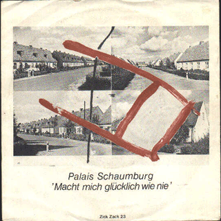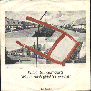 PALAIS SCHAUMBURG (Hamburg):"Rote Lichter" 7" 1981/ZickZack ZZ23 Roter Lichter/Macht mich glücklich wie nie Zur Besetzung gehören Holger Hiller (Fähnlein Fieselschweif und diverse Soloveröffentlichungen), Thomas Fehlmann, Timo Blunck (Die Zimmermänner) und Ralf Hertwig (Bergtraum und Front), anfangs auch Mufti aka FM Einheit (Abwärts und Einstürzende Neubauten). [...] Aber das Niveau steigt: Palais Schaumburg