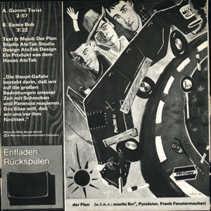 DER PLAN (Düsseldorf):"s/t" 7" 1979/Art Attack ?/?/?/?/?/?/? Erste Veröffentlichung des "Weltaufstandplans", wie Moritz Reichelt, Frank Fenstermacher und Kurt Dahlke sich früher nannten. Bei dieser frühen Platte wirkten noch Chrislo Haas und Robert Görl mit, die anschließend bei der Deutsch-Amerikanischen Freundschaft spielten. Aus Art Attack wurde kurze Zeit später das Label Ata Tak, geführt von Moritz Rrr. Die Aufnahmen wurden mit einem Cassetten-Diktiergerät während einer längeren Session mitgeschnitten. Es gibt leider keine Titelangaben, außer dem Hinweis auf dem Innenlabel, das ein Stück names "Das Fleisch" (das irrtümlich oft als Singletitel herhalten muß) nicht von Der Plan, sondern von Moritz Rrr arrangiert wurde.