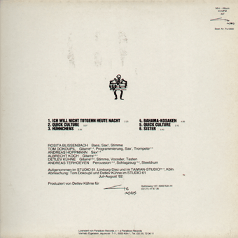 S.Y.P.H. (Solingen):"S.Y.P.H." LP 1981/Pure Freude PF 15 Die Depp/Hänschen Horror/Lämmerschwanz/Nachbar/Satarasch/Little Nemo "Von irgendwoher Can ich diese Musik. Sechs weitere Stücke aus der Studiosession im Inner Sapce mit Holger Czukay, Köln, 1980, zugleich mit der zweiten LP PST entstanden. Was erwartet den Hörer? Vier kurze Stücke, die ohne rhythmisches Treppengeländer Stimmungen von Angst und Unsicherheit heraufbeschwören, verschachtelte Räume, Klangteppich, kristallklare Gespinste etzeterapipapo. Was erwartet ihn noch? Zwei lange Stücke. Das eine ist weniger lang, das andere eine ganze Seite lang. Das kürzere lange Stück heißt Nachbar, ist störungsfrei rütmisch, formschön, beinahe heiter und von der Atmosphäre her sowas wie westeuropäische Meditationsmusik (9 oder die Kunst, einen VW zu schieben (abgeleitet von: 10 oder die Kunst, ein Motorrad zu warten)), und ebenso wie beim Stück Little Nemo (seine genaue Länge gibt Hary Rag mit 18.03 Min. an), bemerkt man unterkühlte Improvisationen, originelle Dub-Effekte und das vergeblich Warten auf einen Höhepunkt. Einen inhaltlichen Bezug zu dem Pionier-Kinder-Comic Little Nemo herzustellen, wird allerdings nur Personen mit großer Assoziationsbreite möglich sein. Um in einem jahreszeitlich angemessenen Vergleich zu bleiben: Von einem gerade gewachsenen Baß-/Trommel-Stamm zweigen in unregelmäßigen, trotzdem wohlgesetzten Abständen Gitarre und Stimmen ab, an denen Lametta und Glitzer French Horn, Mundharmonika, percussive Akzente das schmückende Beiwerk bilden. Ich-2 werde mir die Platte selten anhören, da sie zum trivialen Verschleiß nicht geeignet ist, während ich-1 die Platte als interessantes Dokument der progressiven S.Y.P.H.-Paralyse einschätze, die ich mir durchaus als angenehme akustische Tapete auf dem Weg zum Gipfel der Normalität vorstelle." (Xao Seffcheque, O.R.A.V., Sounds Nr.2/Februar 1982)