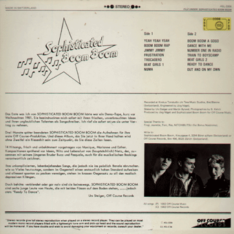 SOPHISTICATED BOOM BOOM (Büren) : "s/t" LP 1982/Off Course ASL 3306 Yeah Yeah Yeah/Boom Boom Rap/Jimmy Jimmy/Frustration/Trocadero/Beat Girls 1/Numa/Boom Boom a gogo/Dance with me/Number One in Radio/Train to Boyscamp/Beat Girls 2/Ready to dance/Out and on my own Erfrischender Girlie-Pop-Punk. Die Musik wird von Buzz, Netz und Pasquale von SOZZ unterstützt.