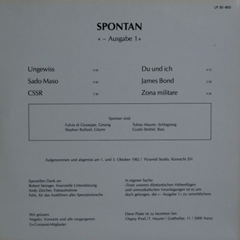SPONTAN : "Augabe 1" 12" 1982/Orgasy Prod. Ungewiss/Sado MAso/CSSR/Du und Ich/James Bond/Zona Militare