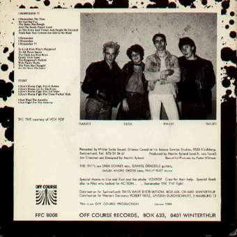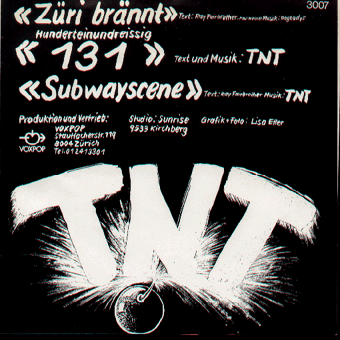 TNT (Zürich) : "s/t" 7" 1979/Vox Pop 3007 Züri bränn/131/Subwayscene +Textbeilage "Thema Krawall:1979 haben ihn TNT mit "Züri brännt" vorweggenommen.Die Platte ist wieder aufgelegt worden-weil´s die Hymne ist oder um die schnelle Mark zu machen?TNT sind jedenfalls eine der besseren Schweizer Punk-Gruppen(Voxpop)." (Alfred Hilsberg, Sounds 5/81)
